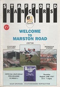 Match: Stafford Rangers v Redditch United Competition: Dr Martens League Midland Division Date: 19-08-1997 Comments: Rating: 3 Condition: Good Weight in grams: 60