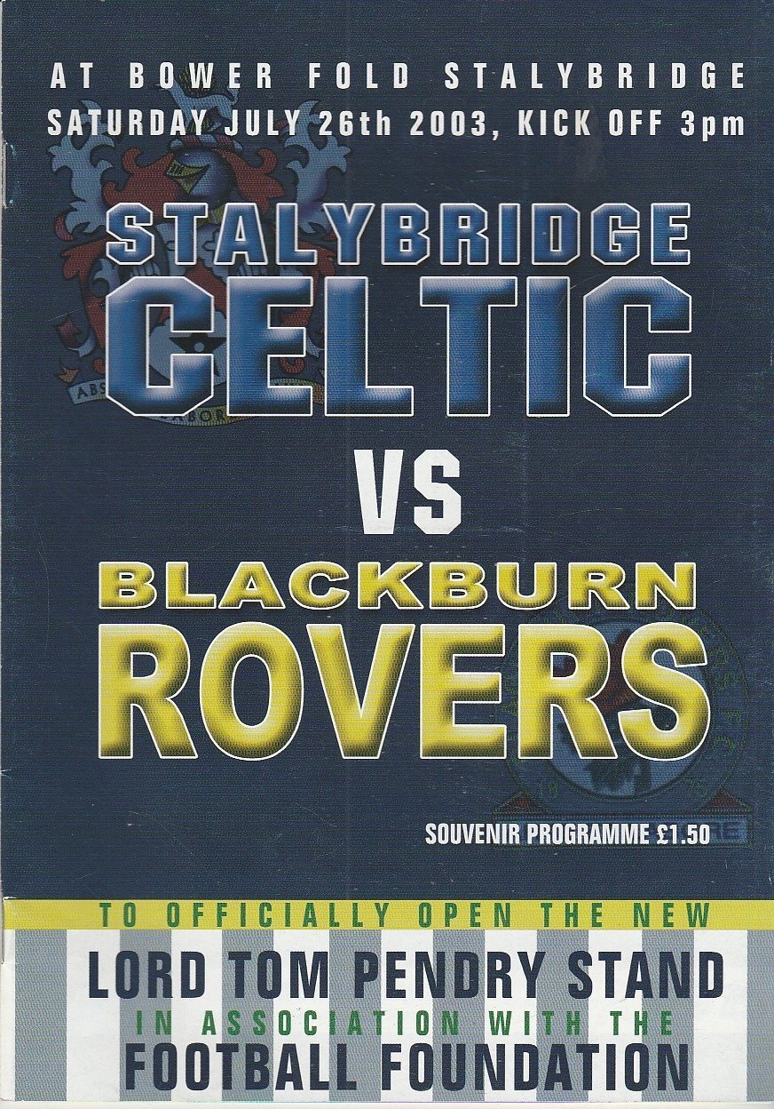 Match: Stalybridge Celtic v Blackburn Rovers Competition: Friendly Date: 26-Jul-2003 Comments: Rating: 4 Condition: Very good Weight in grams: 120