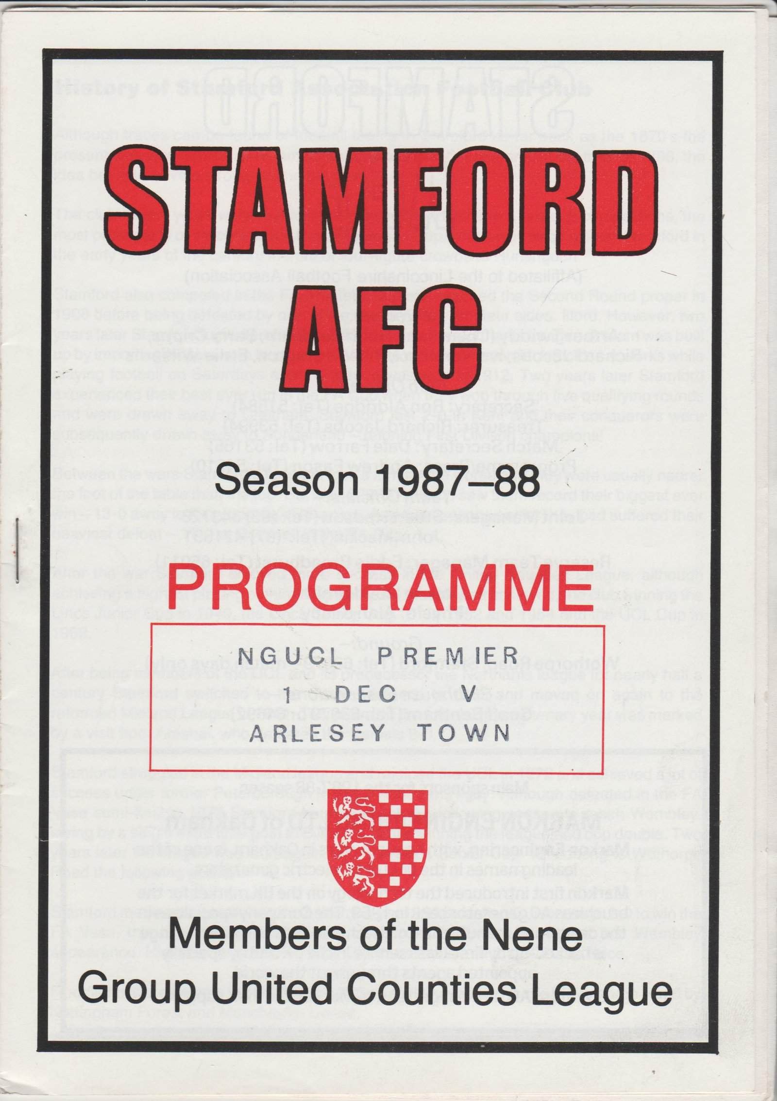 Match: Stamford v Arlesey Town Competition: Nene Group United Counties League Premier Division Date: 01-Dec-1987 Comments: Rating: 3 Condition: Team changes and notes on line ups page Weight in grams: 60
