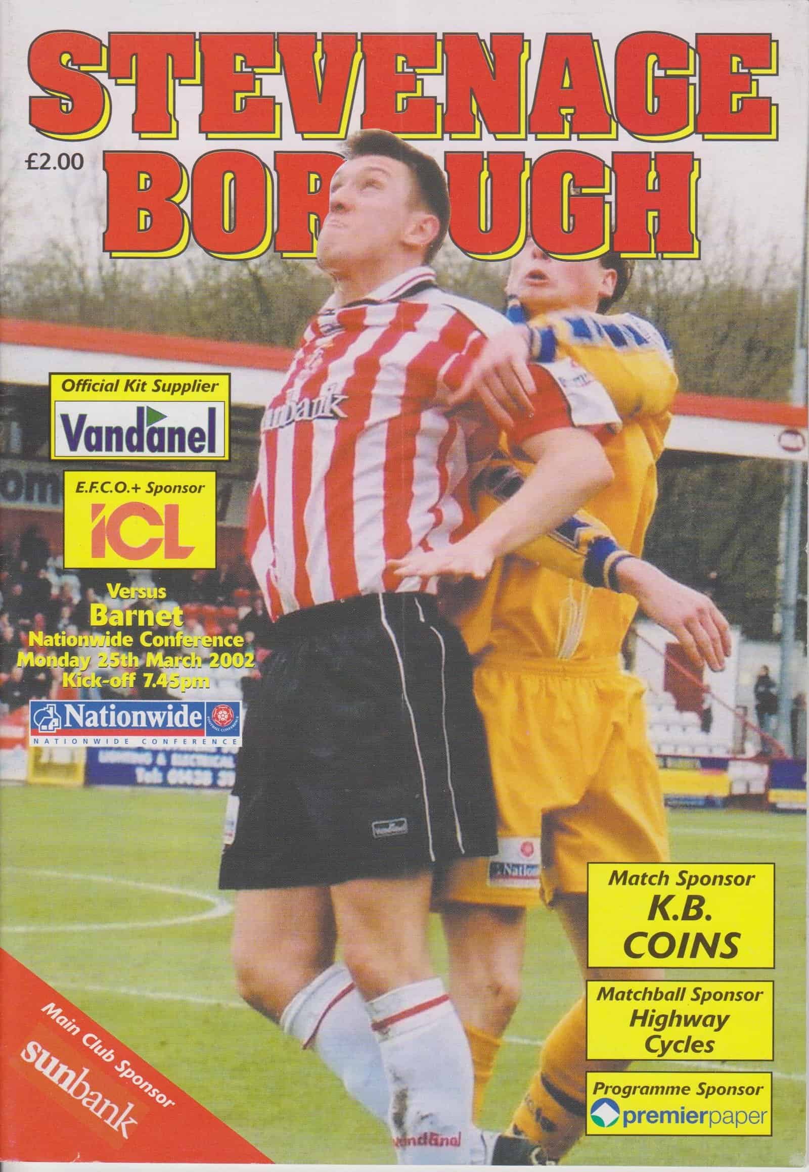 Match: Stevenage Borough v Barnet Competition: Nationwide Conference Date: 25-Mar-2002 Comments: Rating: 4 Condition: Faint fold Weight in grams: 120
