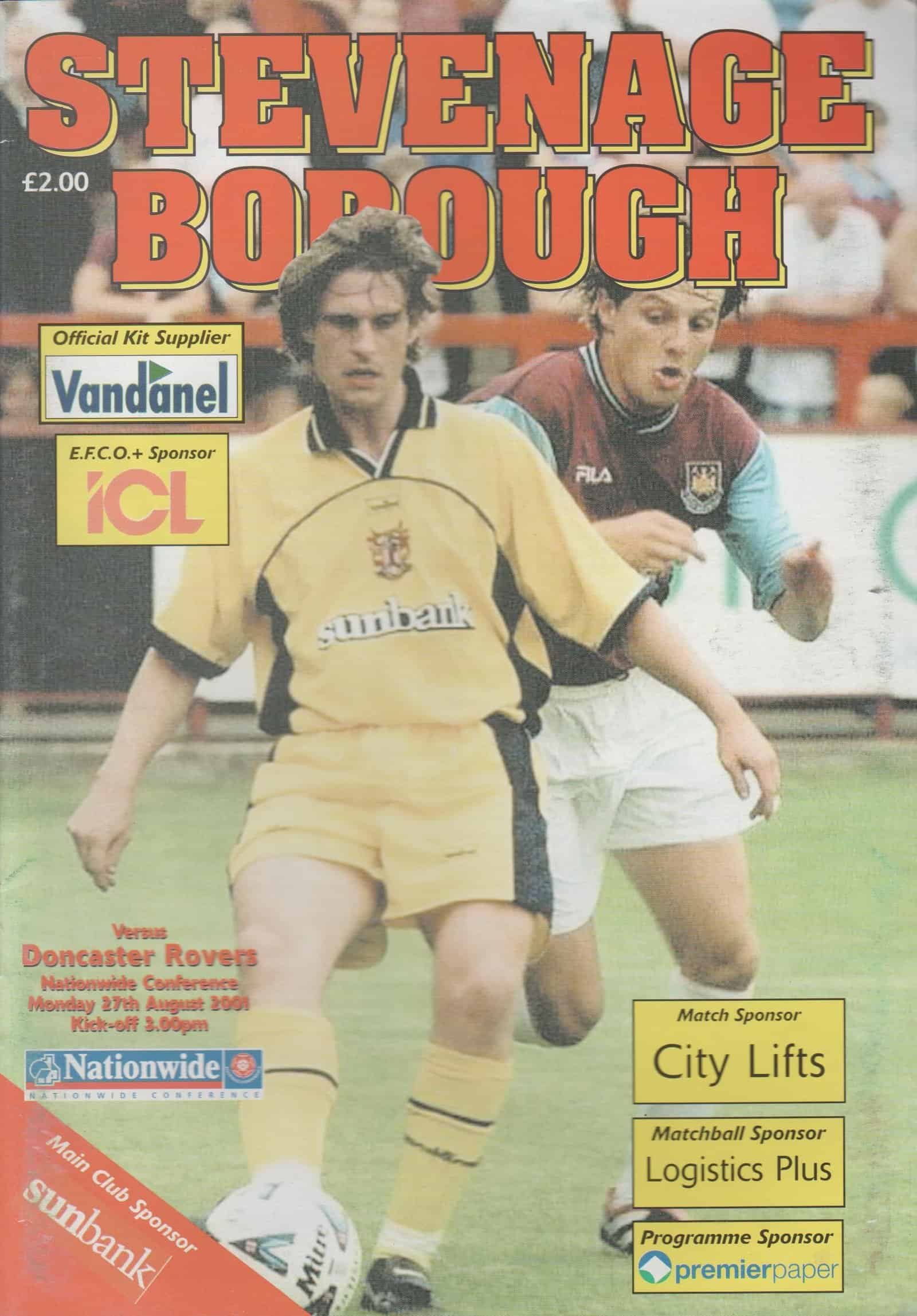 Match: Stevenage Borough v Doncaster Rovers Competition: Nationwide Conference Date: 27-08-2001 Comments: Rating: 4 Condition: Very good Weight in grams: 100