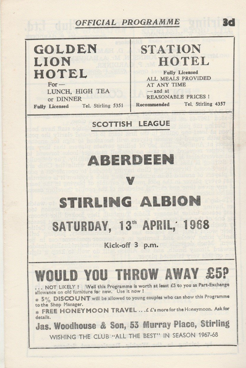 Match: Stirling Albion v Aberdeen Competition: League Division 1 Date: 13-Apr-1968 Comments: Rating: 3 Condition: Slight mark on face Weight in grams: 40