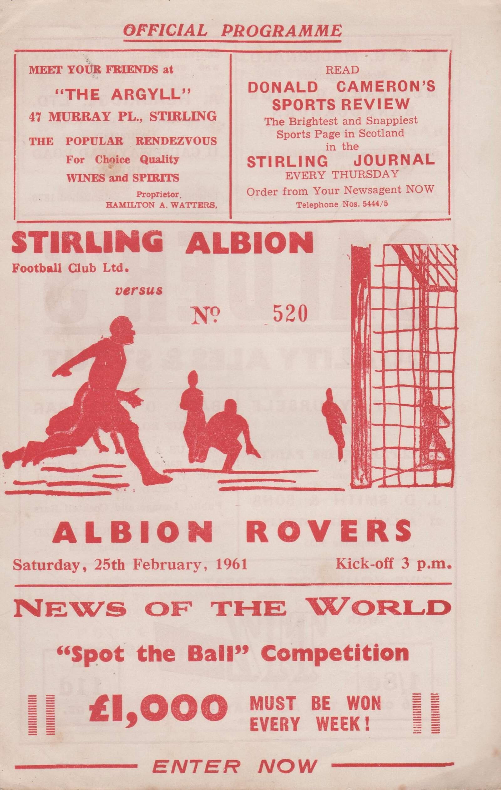Match: Stirling Albion v Albion Rovers Competition: Scottish League Division 2 Date: 25-Feb-1961 Comments: Rating: 3 Condition: Staples removed, some minor blotching near spine Weight in grams: 40