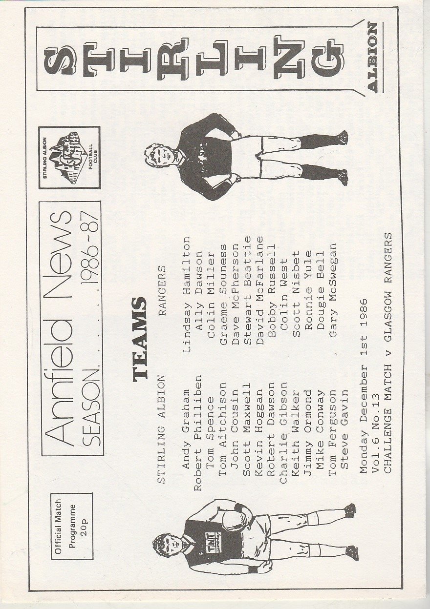Match: Stirling Albion v Glasgow Rangers Competition: Friendly Date: 01-Dec-1986 Comments: 4 page issue Rating: 4 Condition: Very good Weight in grams: 20