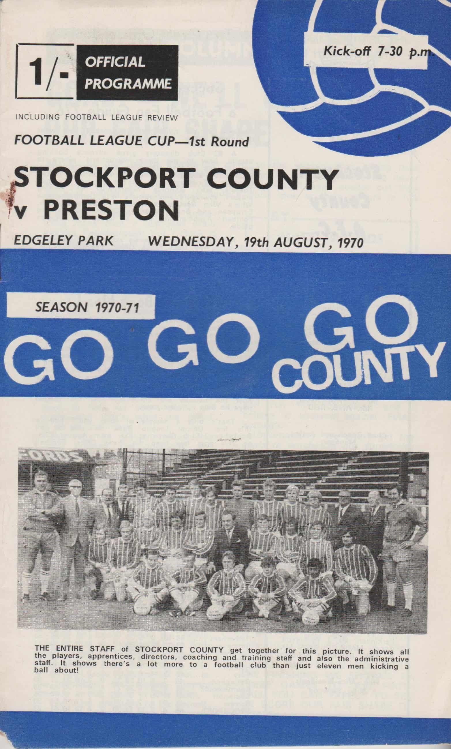 Match: Stockport County v Preston North End Competition: League Cup 1st Round Date: 19-Aug-1970 Comments: Rating: 3 Condition: Small piece cut off edge of spine, slight mark on face Weight in grams: 60