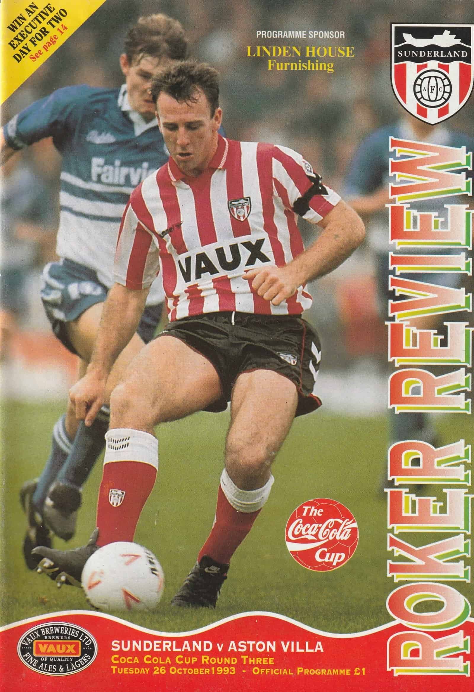 Match: Sunderland v Aston Villa Competition: Coca Cola Cup 3rd Round Date: 26-10-1993 Comments: Rating: 4 Condition: Very good Weight in grams: 100