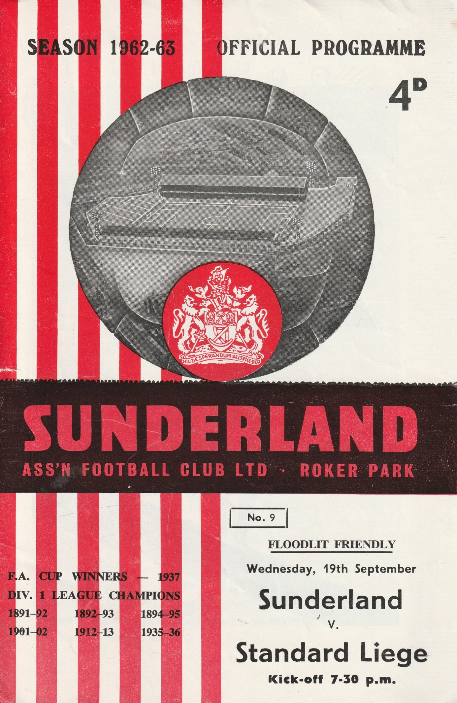 Match: Sunderland v Standard Liege Competition: Friendly Date: 19-Sep-1962 Comments: Rating: 4 Condition: Very good Weight in grams: 60