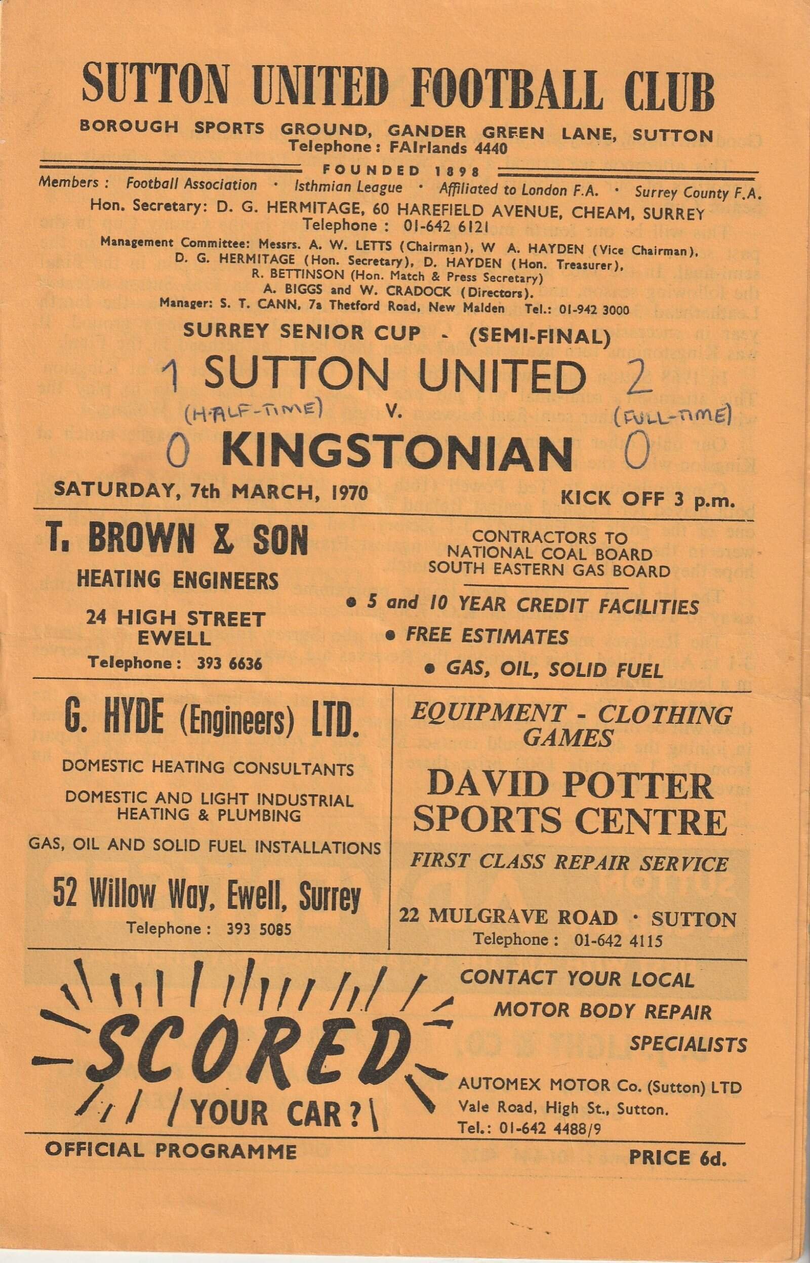 Match: Sutton United v Kingstonian Competition: Surrey Senior Cup Semi Final Date: 07-03-1970 Comments: Rating: 3 Condition: Score on face, team changes Weight in grams: 40