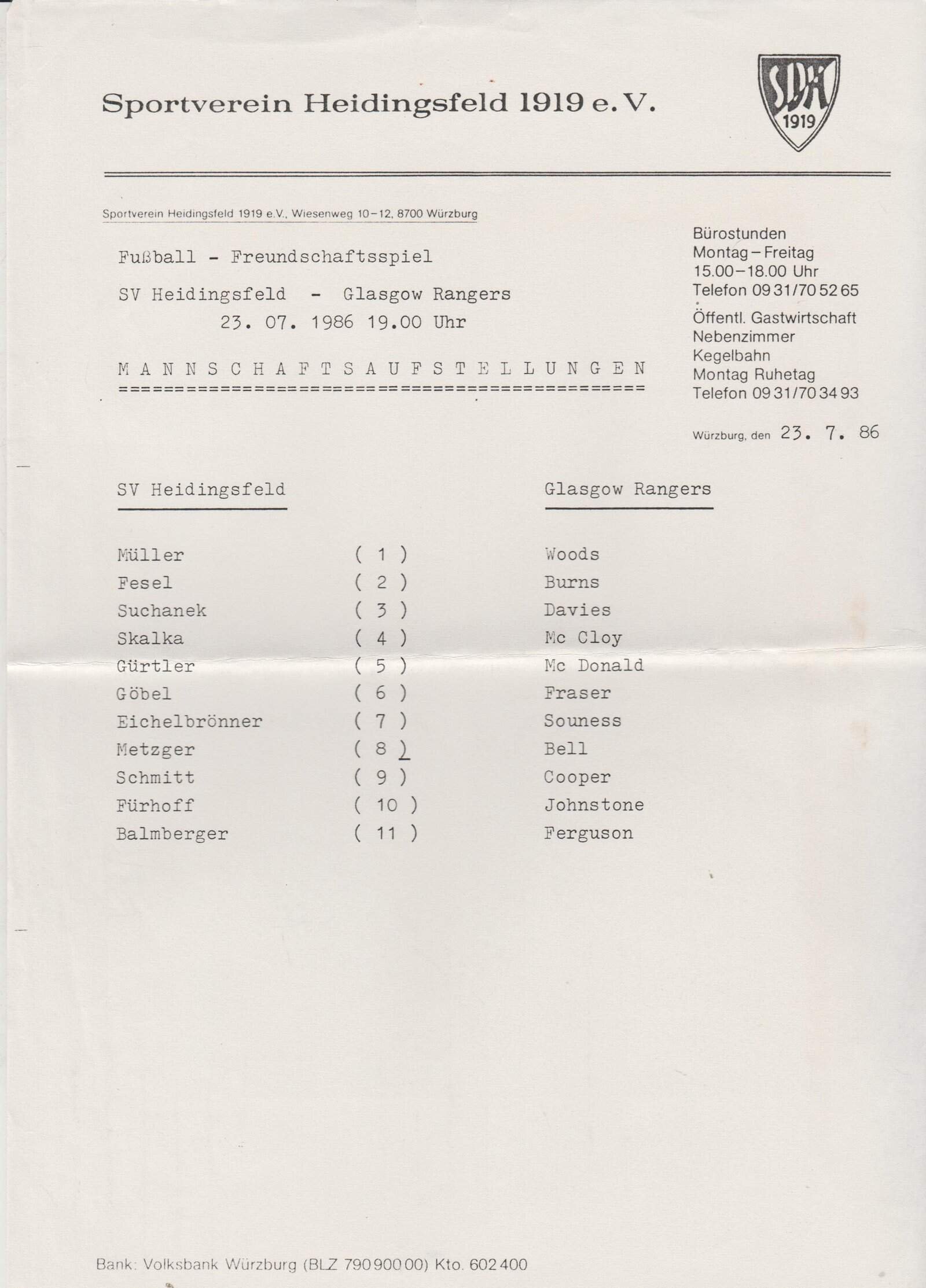 Match: SV Heidingsfeld v Glasgow Rangers Competition: Friendly Date: 23-Jul-1986 Comments: Single sheet issue Rating: 4 Condition: Fold Weight in grams: 40