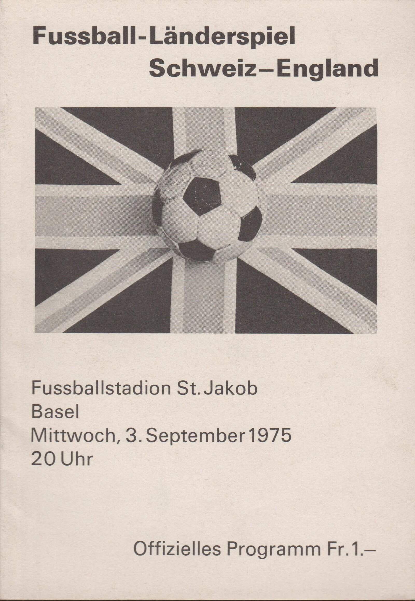 Match: Switzerland v England Competition: International Friendly Date: 03-09-1975 Comments: Rating: 4 Condition: Very good Weight in grams: 80