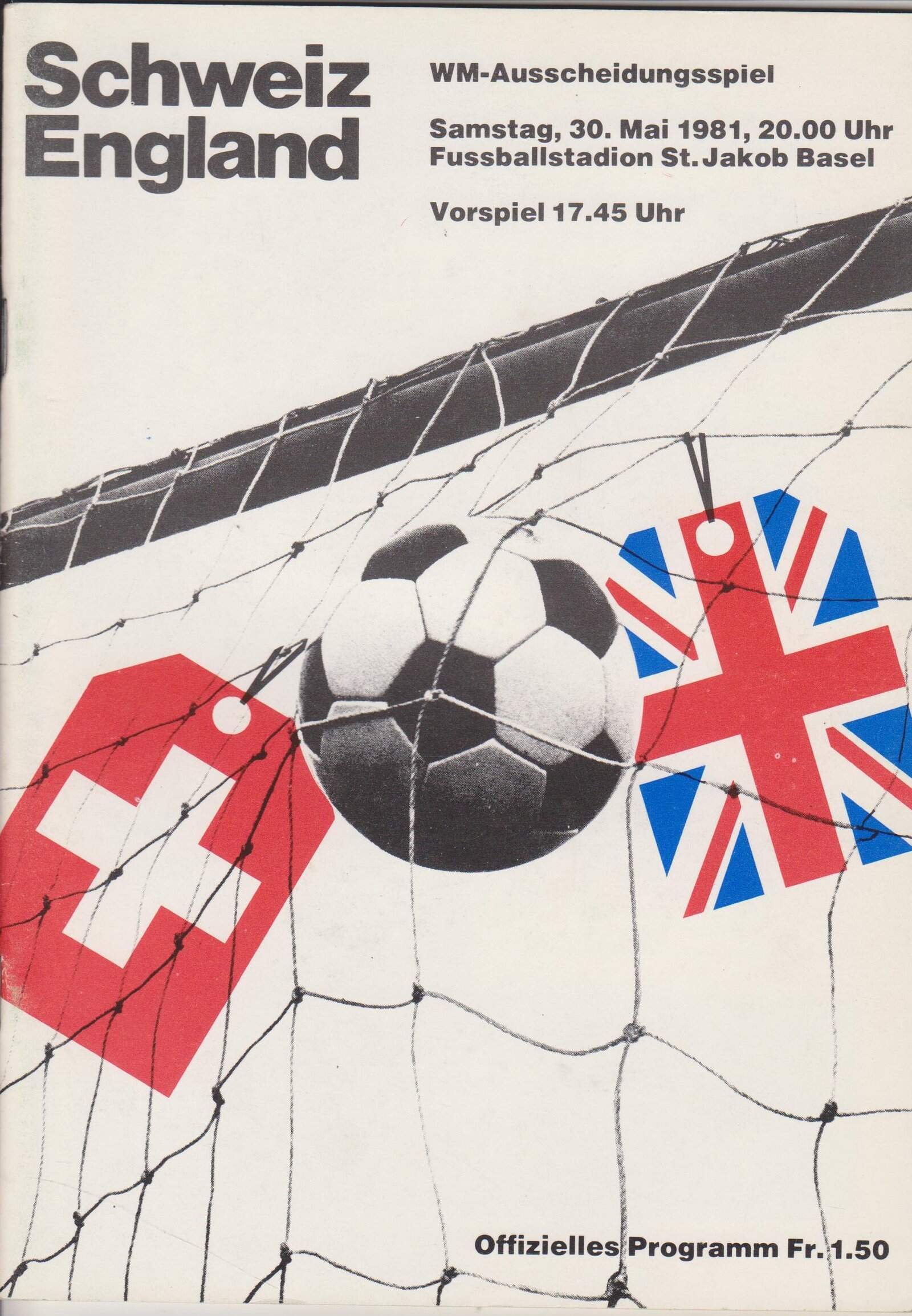 Match: Switzerland v England Competition: World Cup Qualifier Date: 30-05-1981 Comments: Rating: 5 Condition: Excellent Weight in grams: 80