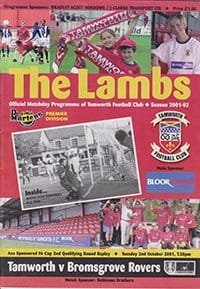 Match: Tamworth v Bromsgrove Rovers Competition: FA Cup 2nd Qualifying Round Date: 02-10-2001 Comments: Rating: 4 Condition: Small tear on back page Weight in grams: 100