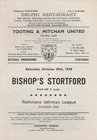 Match: Tooting & Mitcham United v Bishop Stortford Competition: Rothmans Isthmian League Division 1 Date: 30-10-1976 Comments: Rating: 4 Condition: Very good Weight in grams: 20