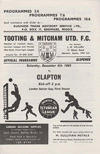 Match: Tooting & Mitcham United v Clapham Competition: London Senior Cup 1st Round Date: 06-12-1969 Comments: Rating: 4 Condition: Very good Weight in grams: 40