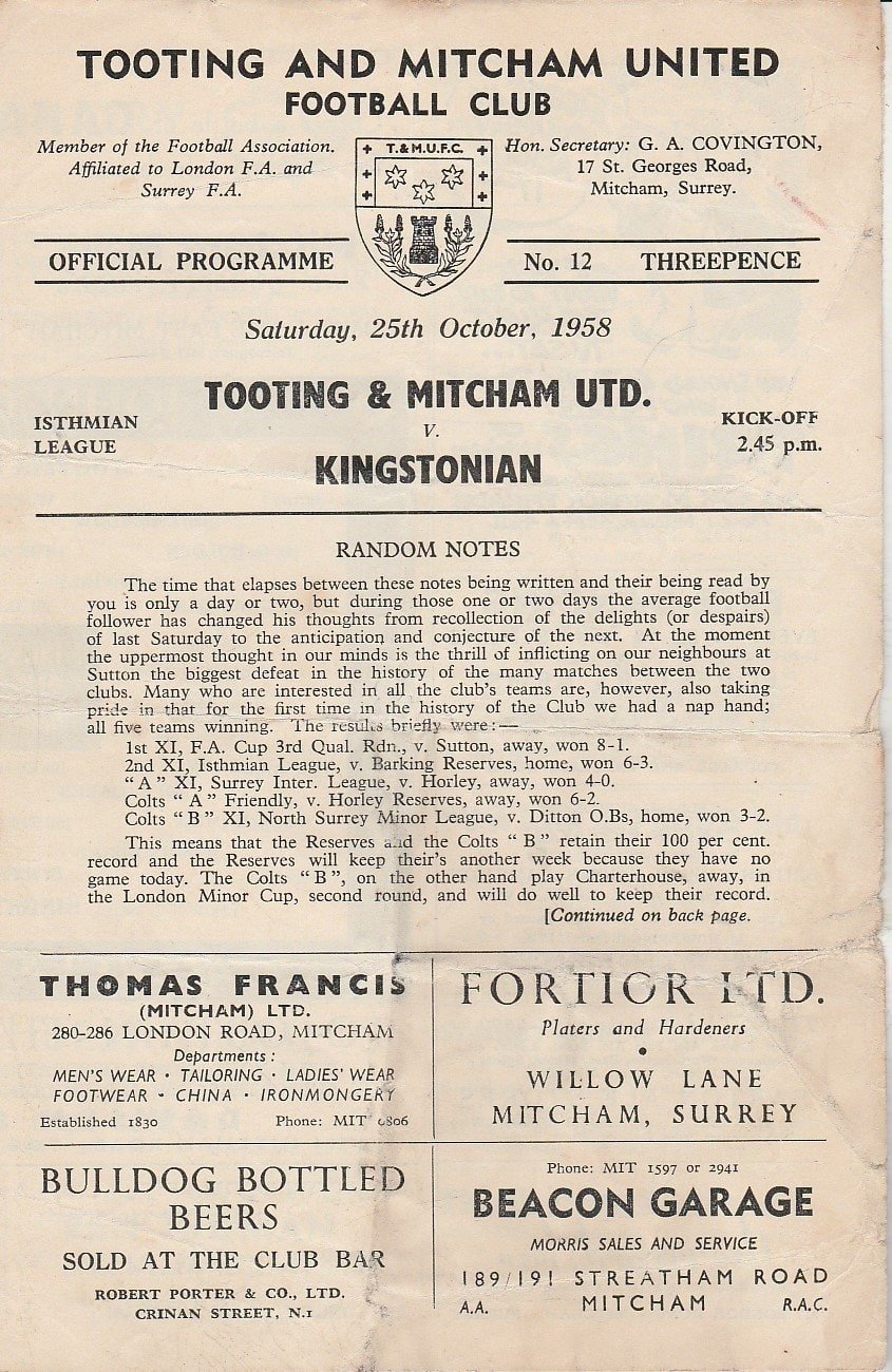 Match: Tooting & Mitcham United v Kingstonian Competition: Isthmian League Date: 25-Oct-1958 Comments: 4 page issue Rating: 3 Condition: Fold, marks on cover, nicks to edge of cover Weight in grams: 40