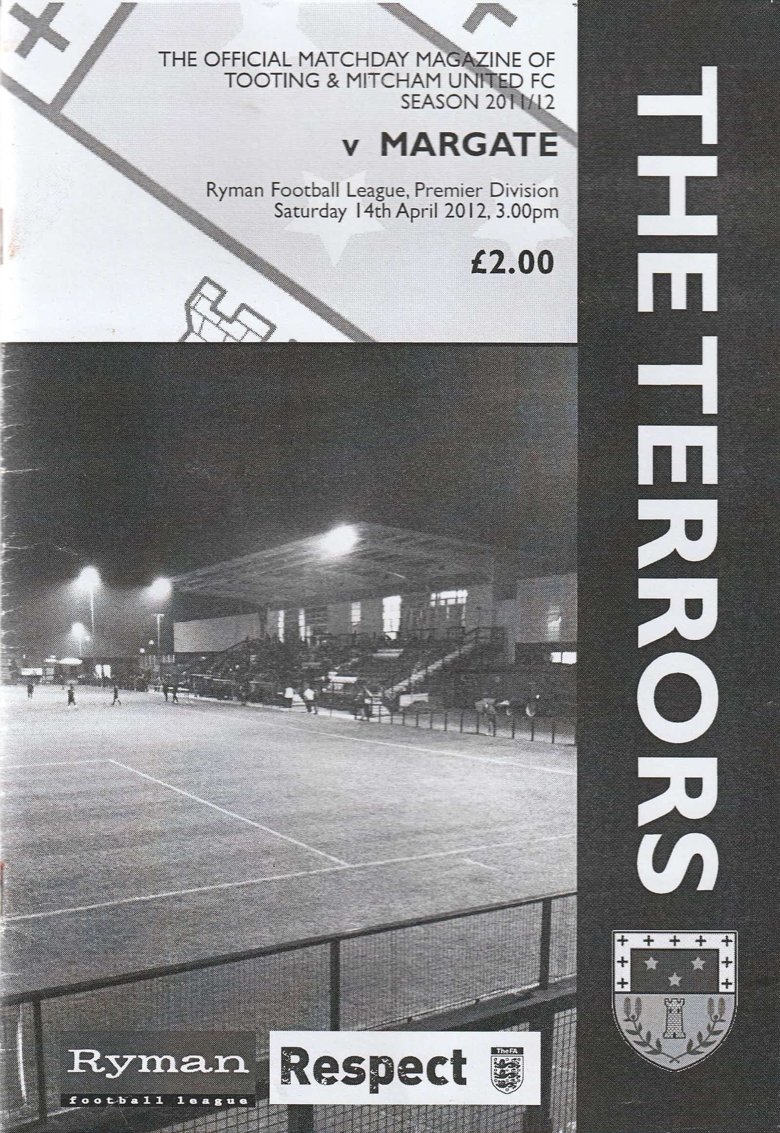 Match: Tooting & Mitcham United v Margate Competition: Ryman Isthmian Premier League Date: 14-Apr-2012 Comments: Contains match reports Rating: 4 Condition: Very good Weight in grams: 120