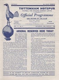 Match: Tottenham Hotspur Reserves v Arsenal Reserves Competition: Football Combination Date: 30-08-1958 Comments: Rating: 4 Condition: Faint fold, team changes Weight in grams: 20