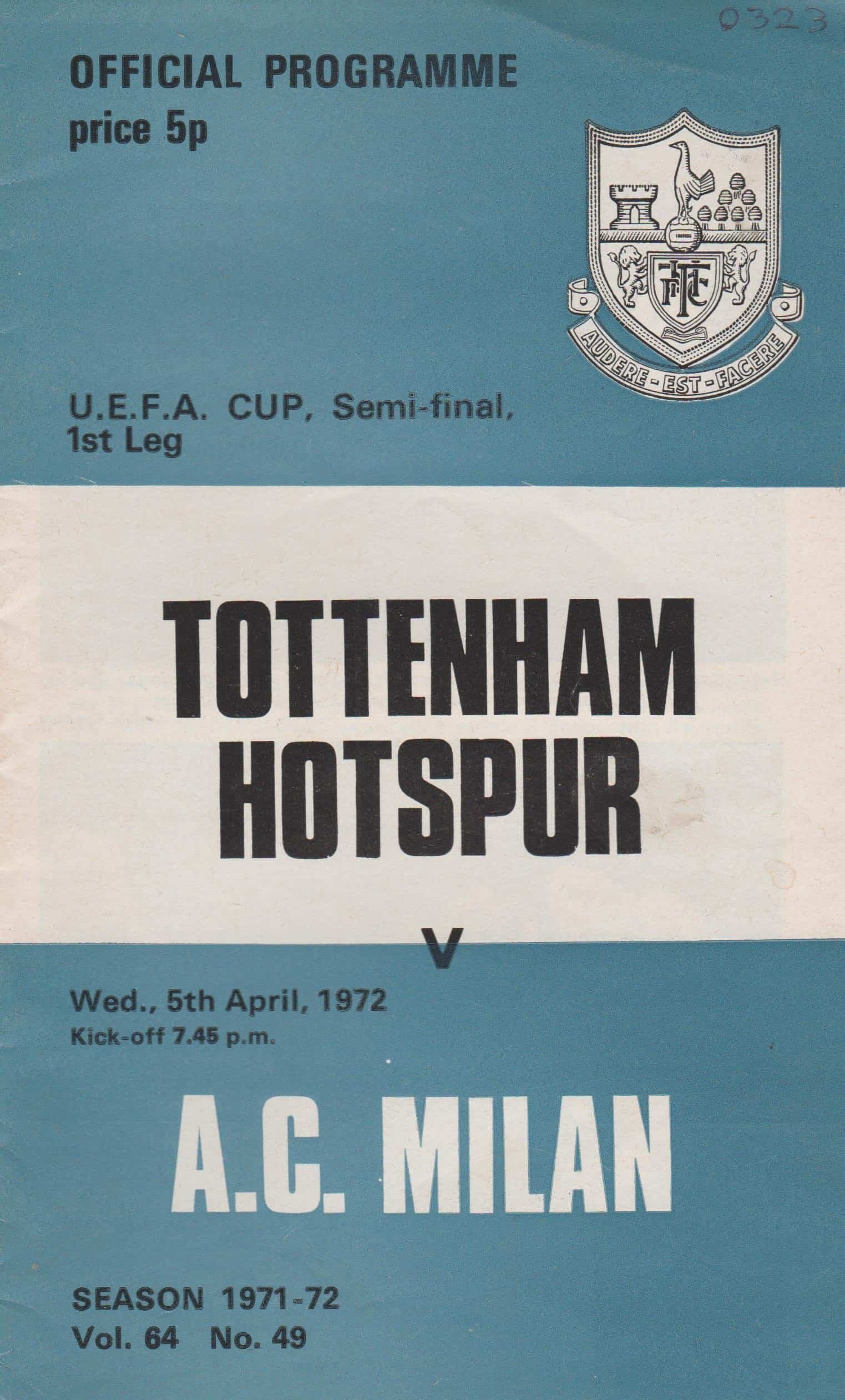 Match: Tottenham Hotspur v AC Milan Competition: UEFA Cup Semi Final 1st leg Date: 05-Apr-1972 Comments: Rating: 3 Condition: Slight fold on cover, slight mark on cover, number on face Weight in grams: 40