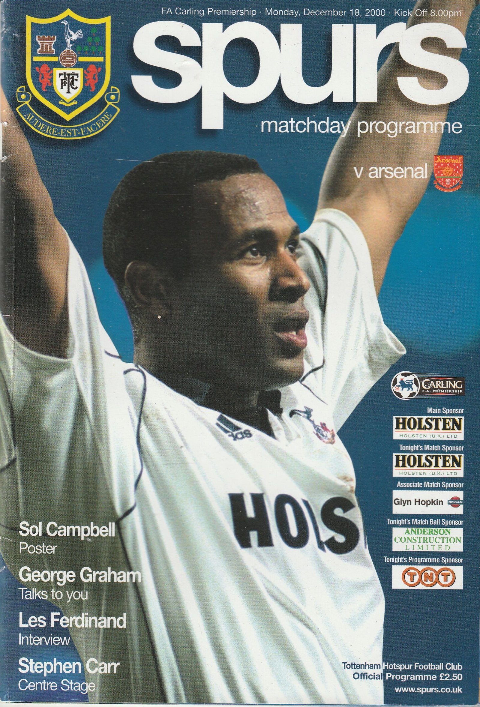 Match: Tottenham Hotspur v Arsenal Competition: Premier League Date: 18-Dec-2000 Comments: Rating: 4 Condition: Light handling wear to cover Weight in grams: 200