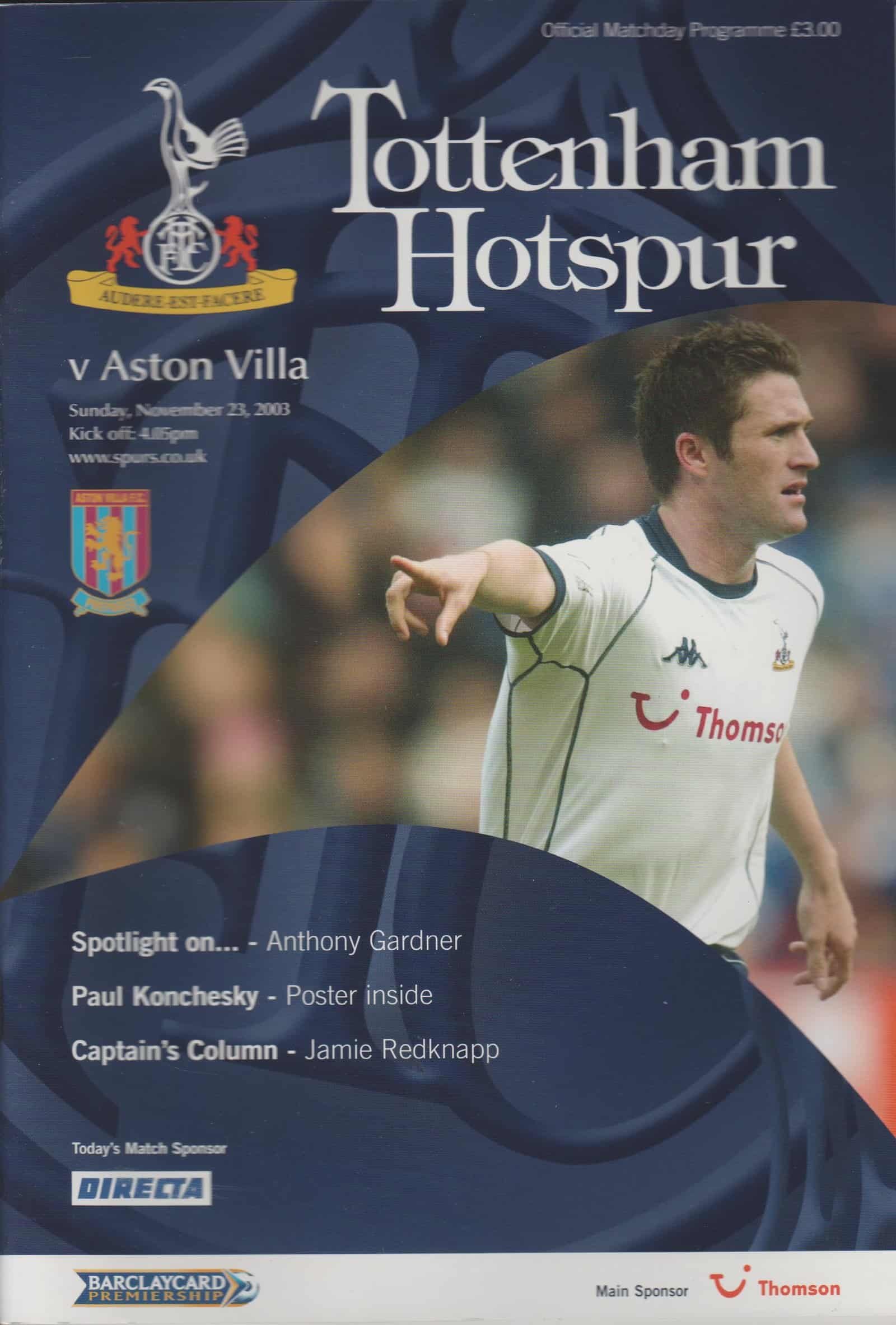 Match: Tottenham Hotspur v Aston Villa Competition: Premier League Date: 23-11-2003 Comments: Rating: 5 Condition: Excellent Weight in grams: 200