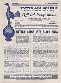 Match: Tottenham Hotspur v Aston Villa Competition: League Division One Date: 29-03-1958 Comments: Rating: 4 Condition: Slight fold, notation in faint pencil Weight in grams: 20