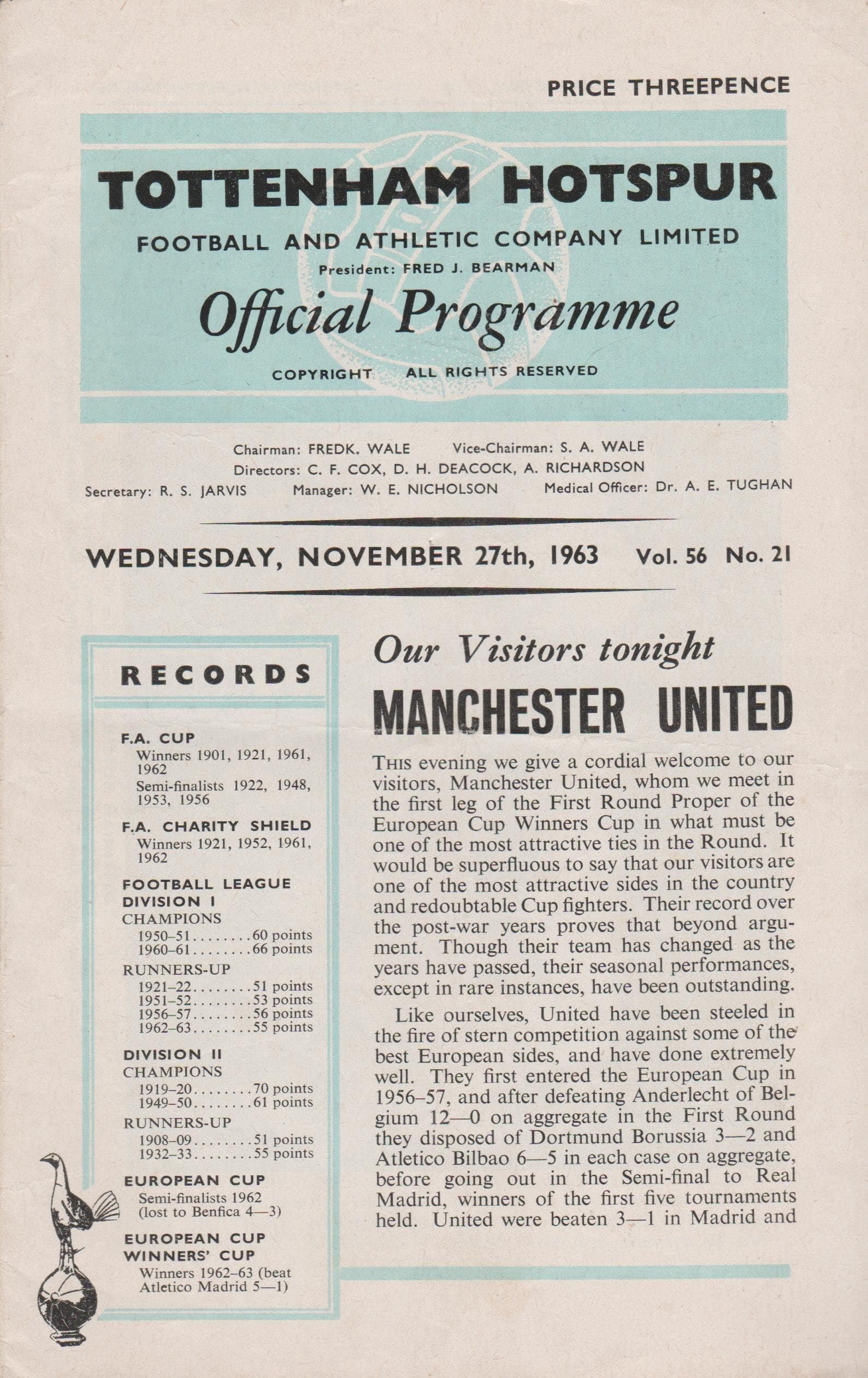Match: Tottenham Hotspur v Manchester United Competition: European Cup Winners Cup 1st Round 1st leg Date: 27-Nov-1963 Comments: Rating: 4 Condition: Very good Weight in grams: 40