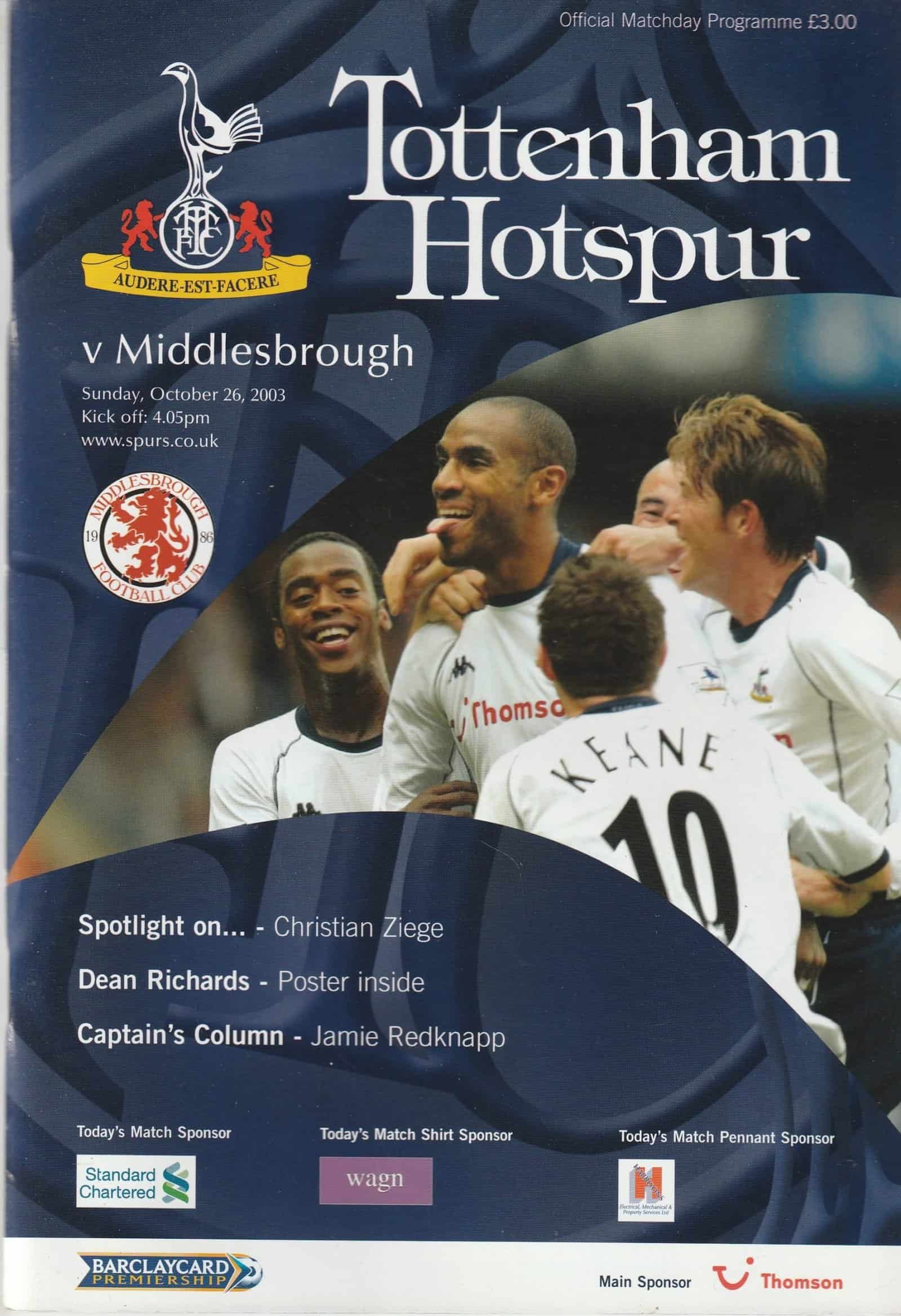 Match: Tottenham Hotspur v Middlesbrough Competition: Barclaycard Premiership Date: 26-Oct-2003 Comments: Rating: 4 Condition: Light handling wear on spine Weight in grams: 180