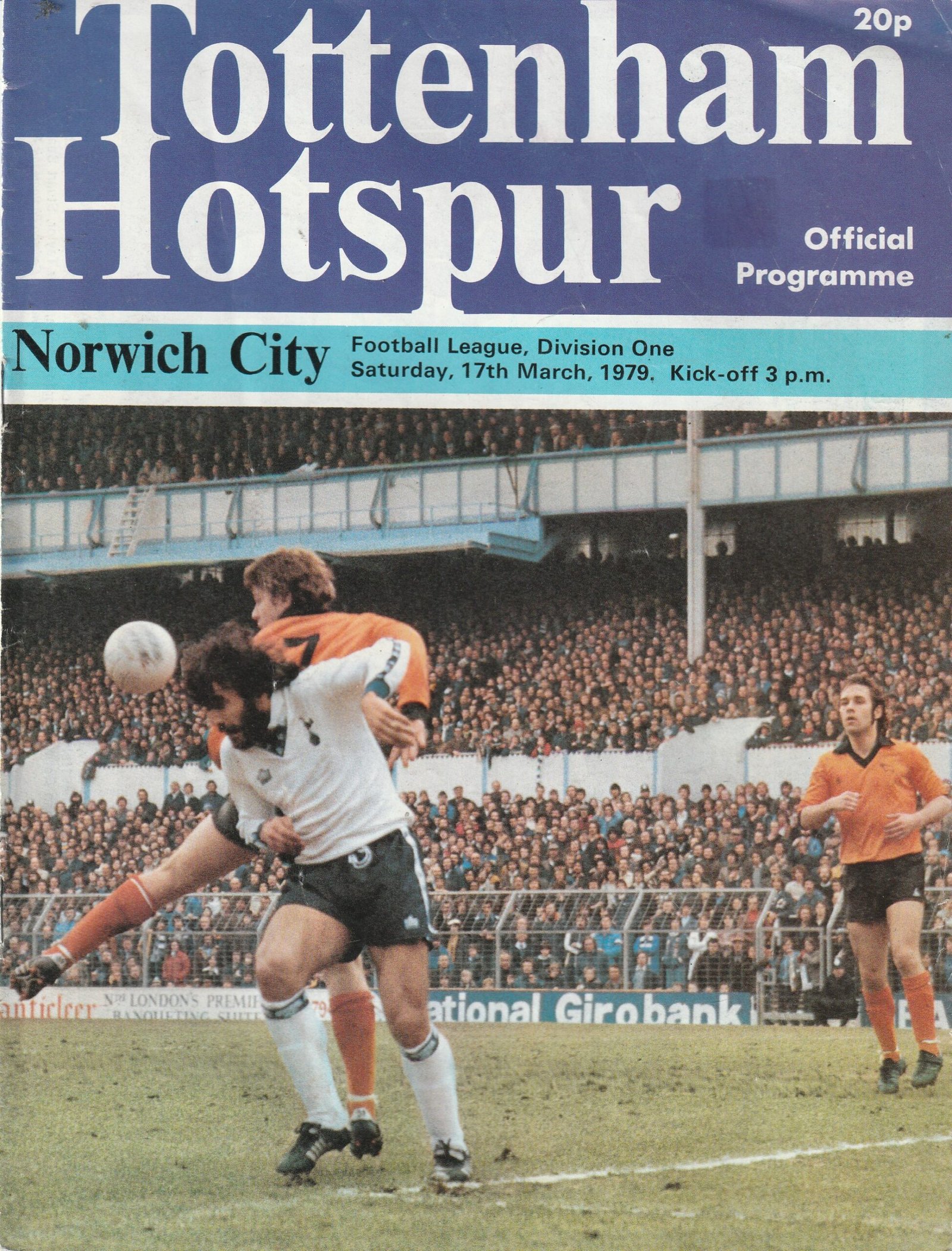 Match: Tottenham Hotspur v Norwich City Competition: League Division 1 Date: 17-Mar-1979 Comments: Rating: 3 Condition: Fold, soiling and marks on back page Weight in grams: 120