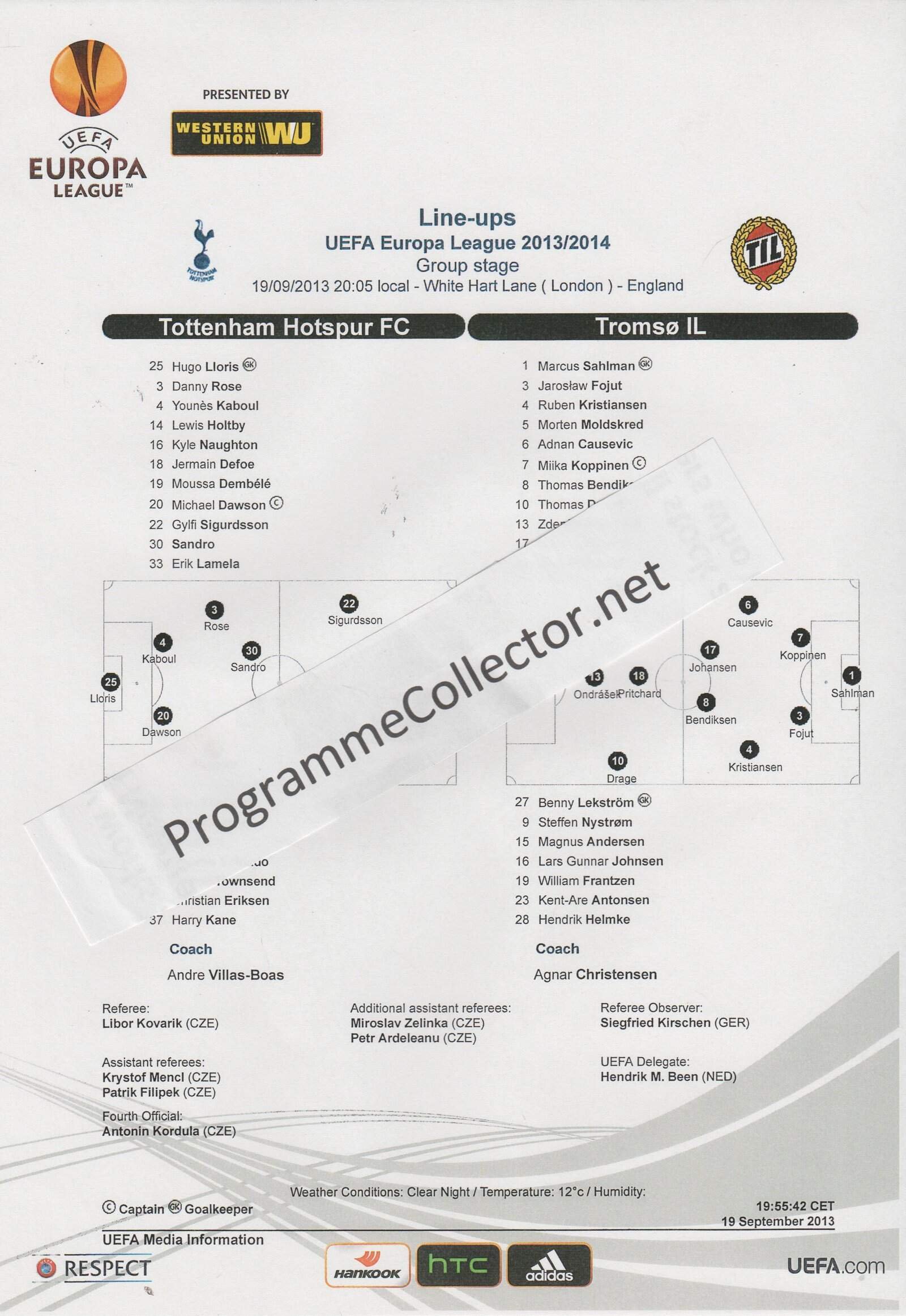 Match: Tottenham Hotspur v Tromso Competition: UEFA Europa League Group K Date: 19-09-2013 Comments: Rating: 4 Condition: Very good Weight in grams: 20