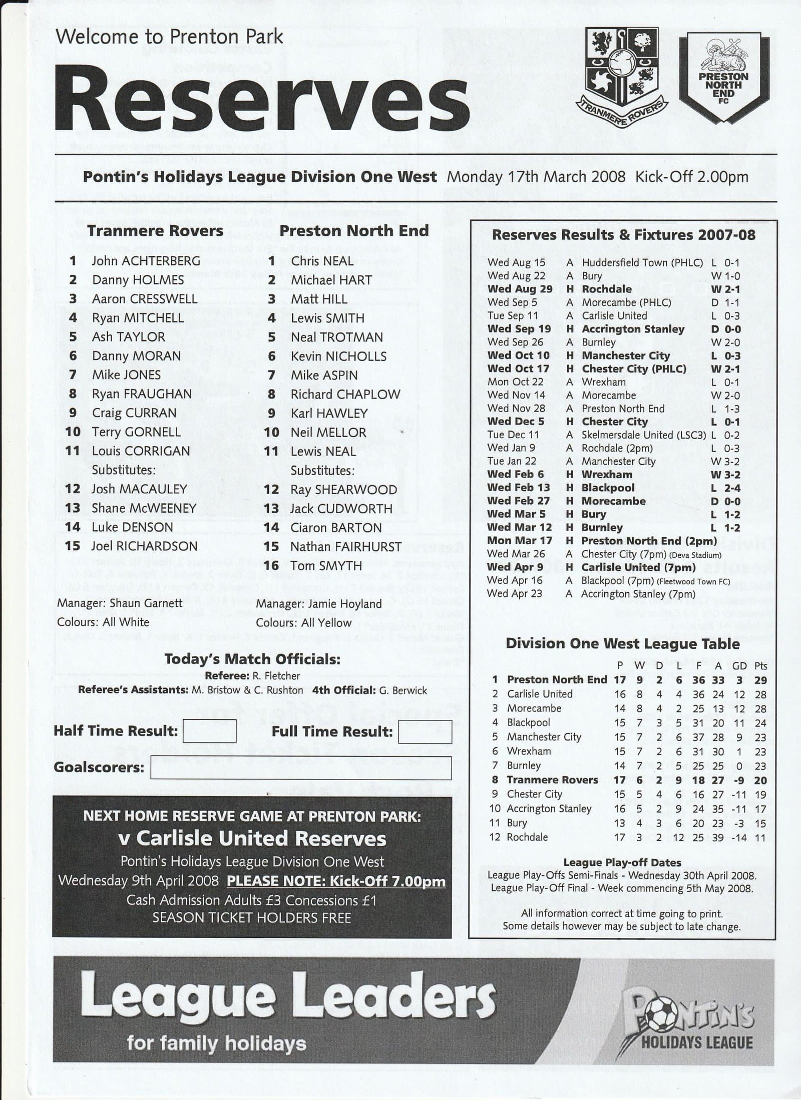 Match: Tranmere Rovers Reserves v Preston North End Reserves Competition: Pontins Holidays League Division 1