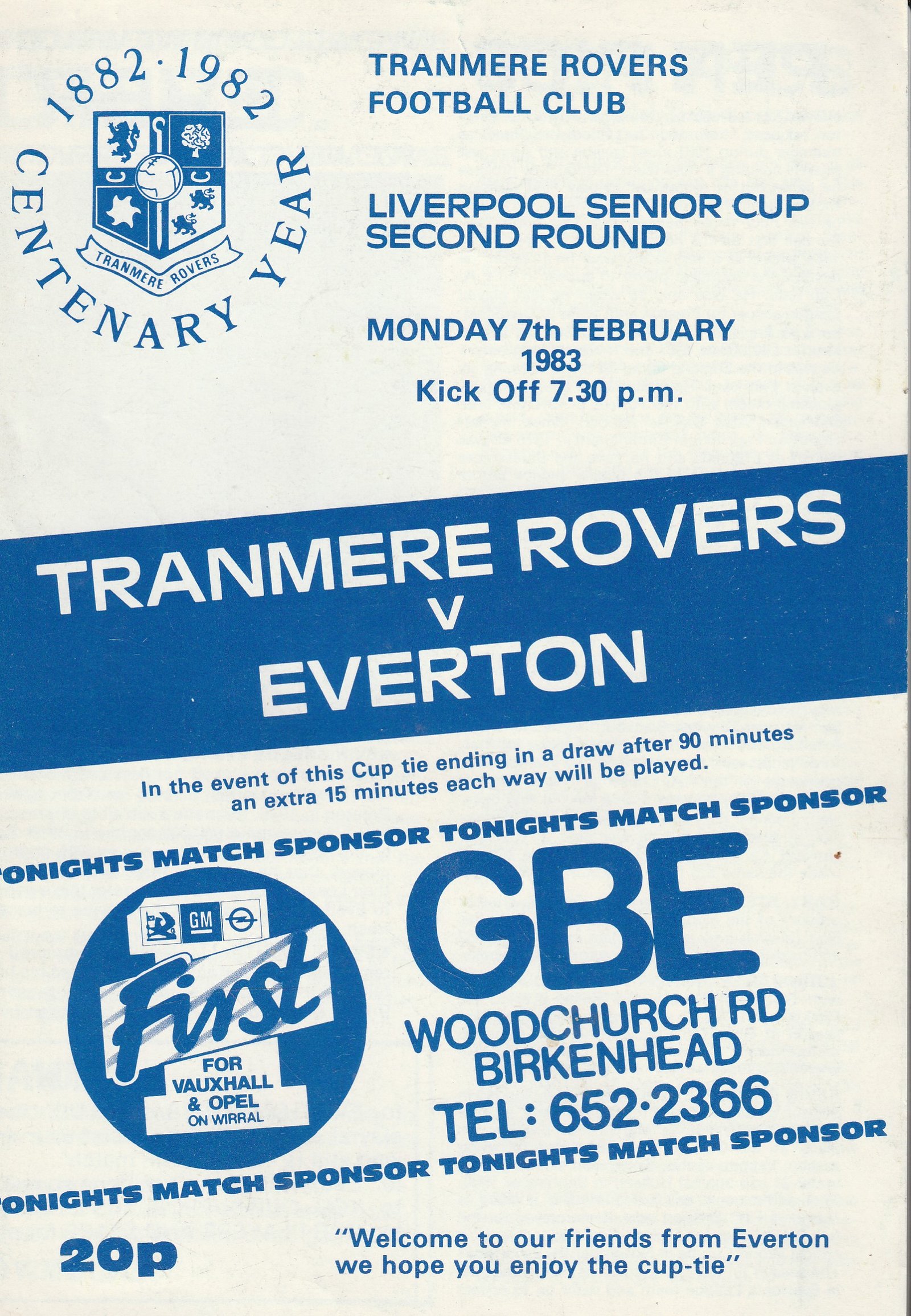 Match: Tranmere Rovers v Everton Competition: Liverpool Senior Cup 2nd Round Date: 07-Feb-1983 Comments: 4 page issue Rating: 4 Condition: Very good Weight in grams: 40