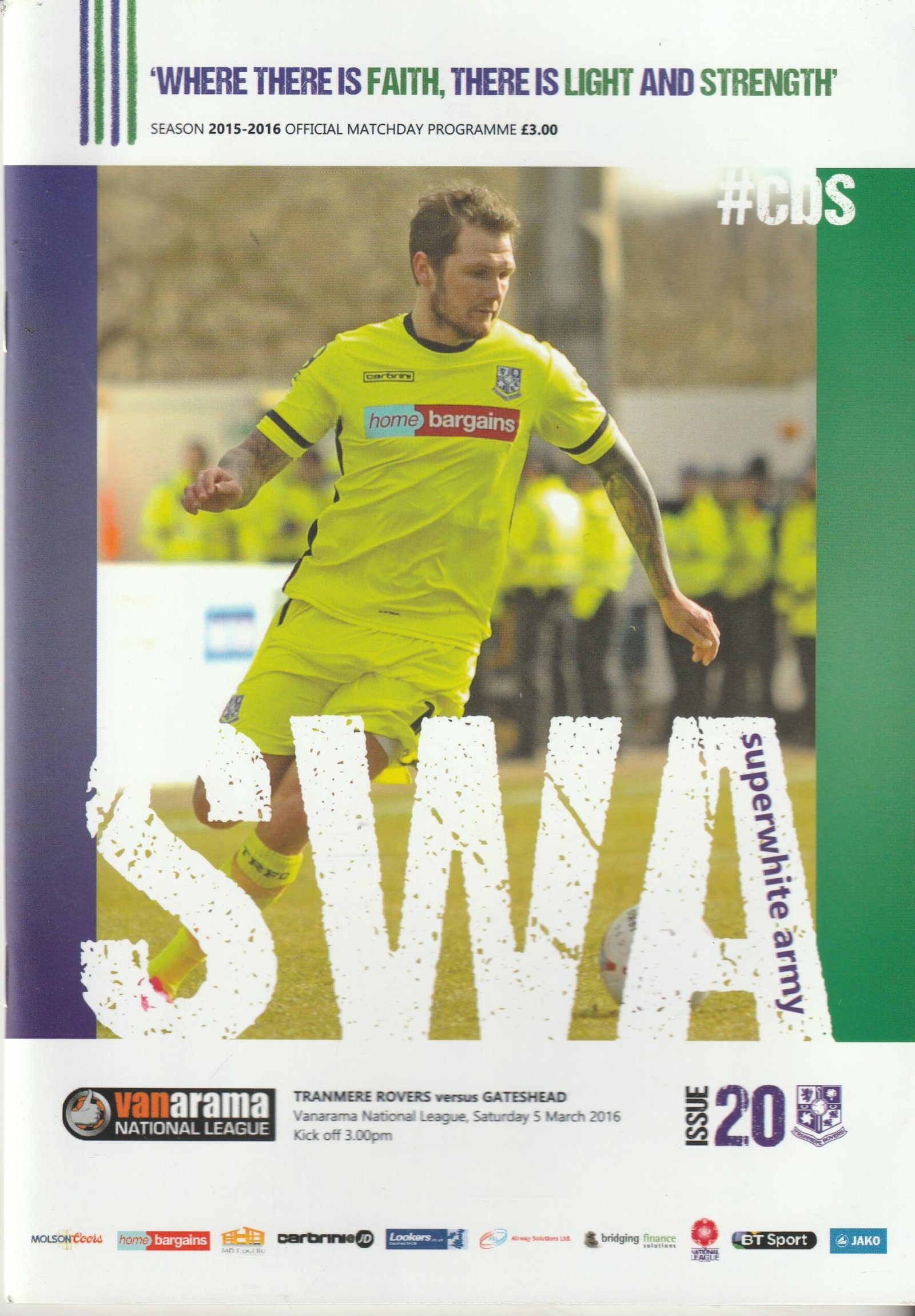 Match: Tranmere Rovers v Gateshead Competition: Vanarama National League Date: 05-Mar-2016 Comments: Rating: 4 Condition: Very good Weight in grams: 260