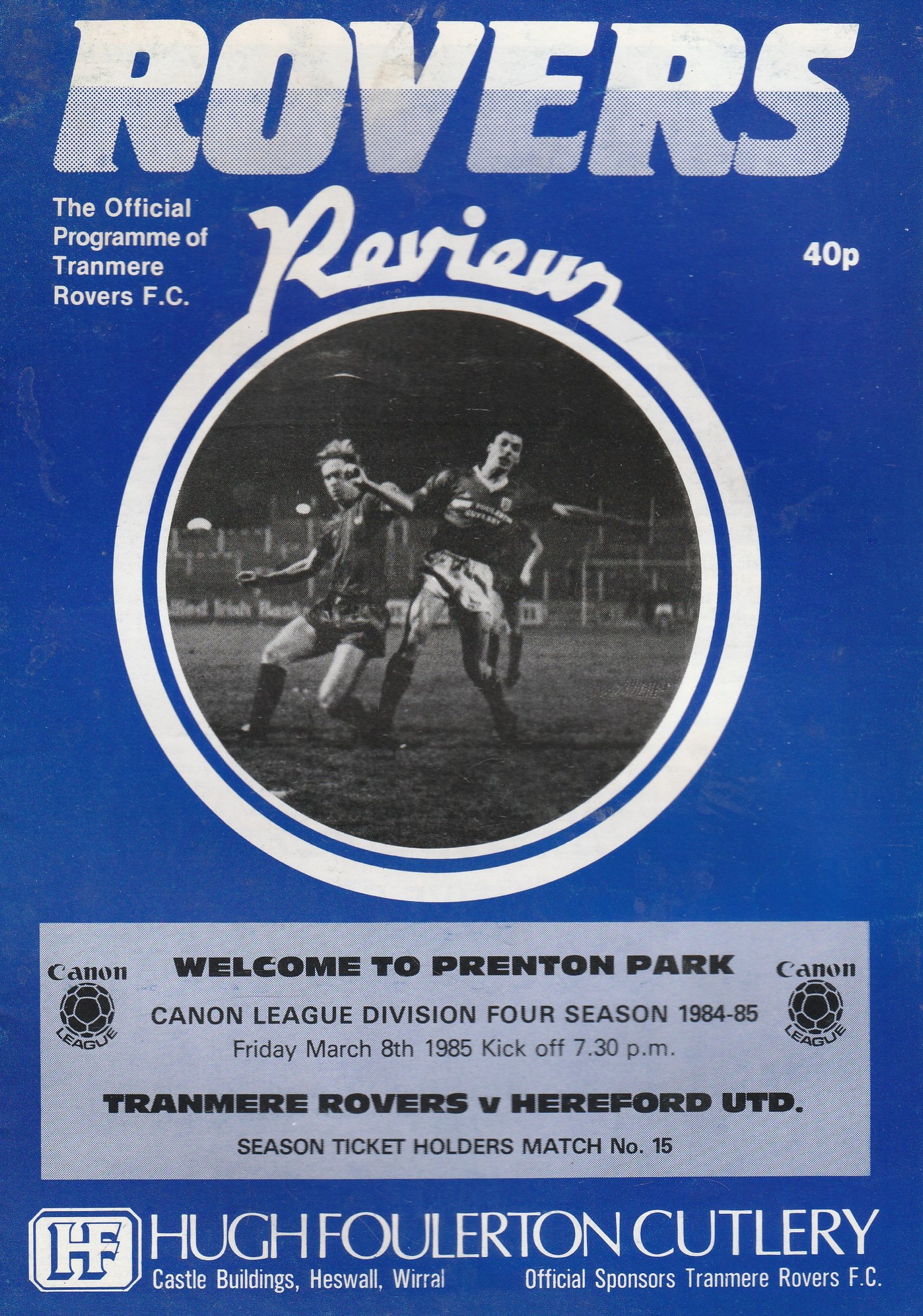 Match: Tranmere Rovers v Hereford United Competition: League Division 4 Date: 08-Mar-1985 Comments: Rating: 3 Condition: Handling wear and marks on back page Weight in grams: 40
