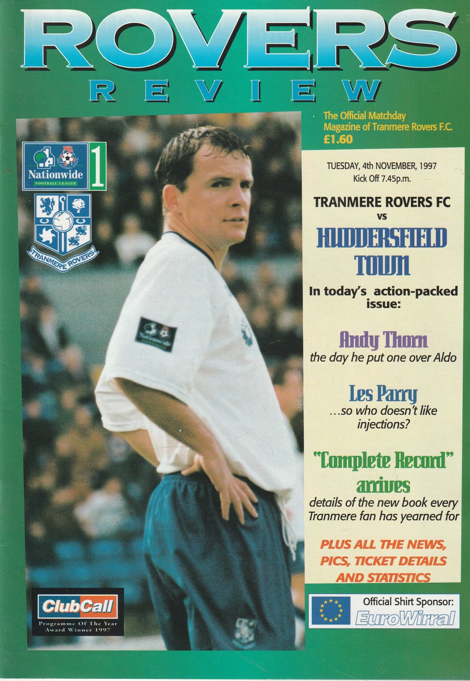 Match: Tranmere Rovers v Huddersfield Town Competition: League Division 1 Date: 04-Nov-1997 Comments: Rating: 4 Condition: Very good Weight in grams: 140