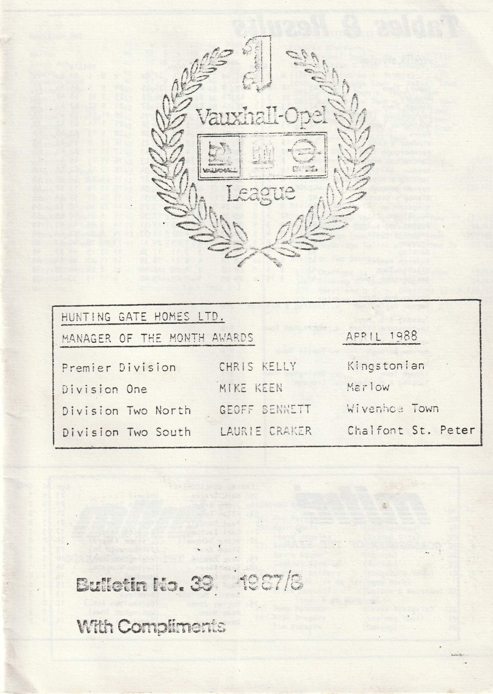 Title: Vauxhall Opel League Bulletin Club: Issue: no39 1987/88 Comments: Final league tables and cup final results Rating: 4 Condition: Very good Weight in grams: 60 Pagination: 16