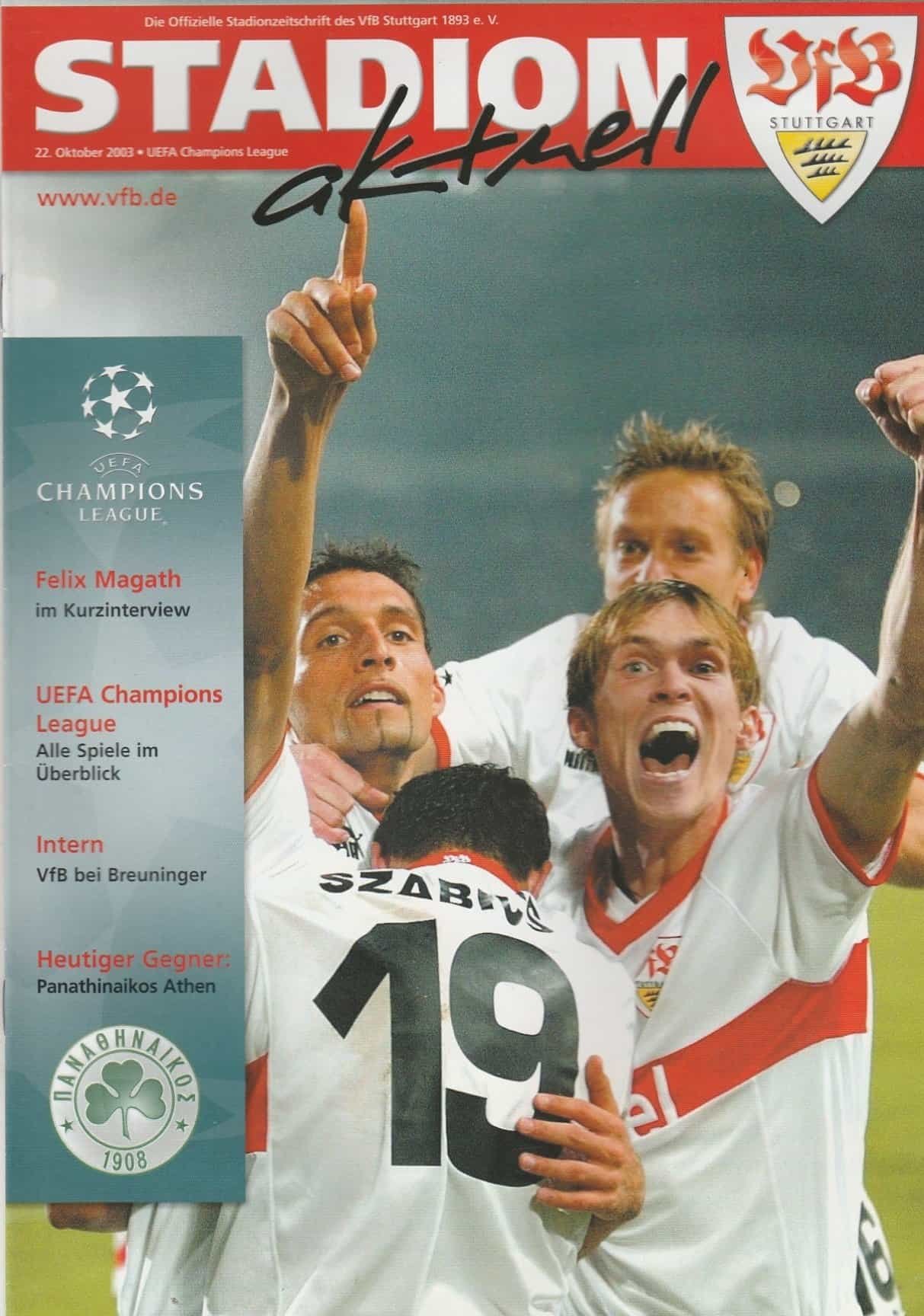 Match: VFB Stuttgart v Panathinaikos Competition:Champions League Group D Date: 22-Oct-2003 Comments: Rating: 4 Condition: Very good Weight in grams: 140