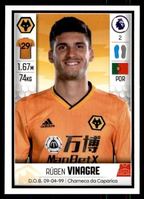 Title: Panini Football Premier League 2020 Club: Wolverhampton Wanderers Player: Rúben Vinagre Collection number: 617 Rating: 4 Condition: Very good Weight in grams: 10