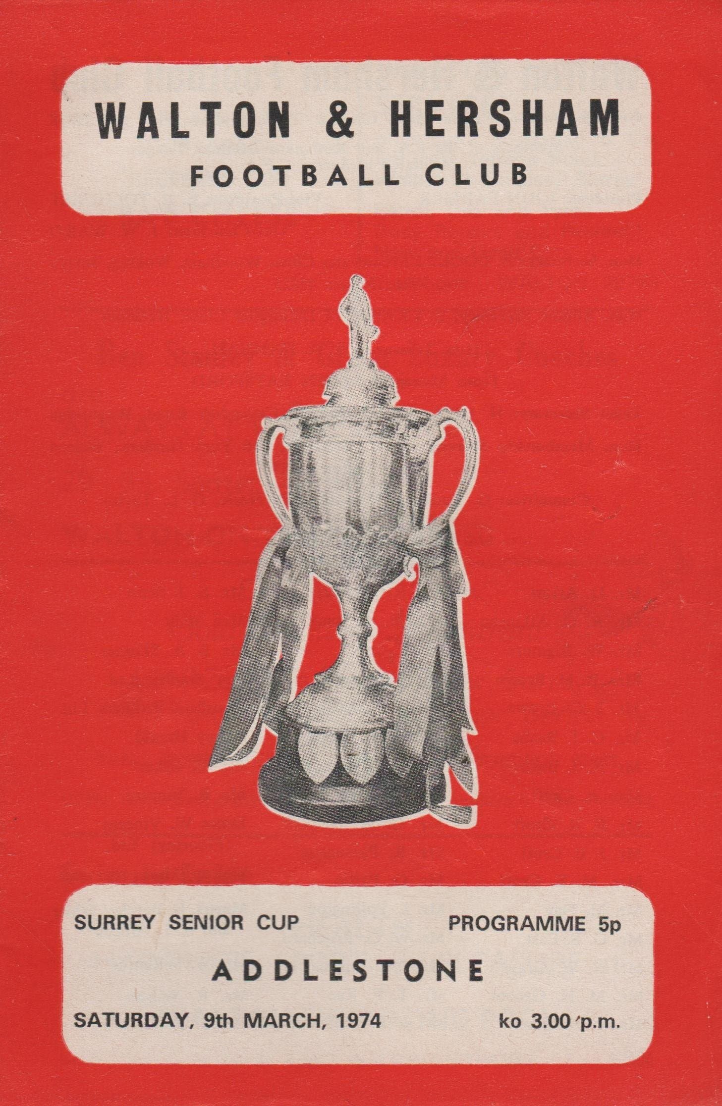 Match: Walton & Hersham v Addlestone Competition: Surrey Senior Cup Date: 09-Mar-1974 Comments: Rating: 3 Condition: Team changes Weight in grams: 40