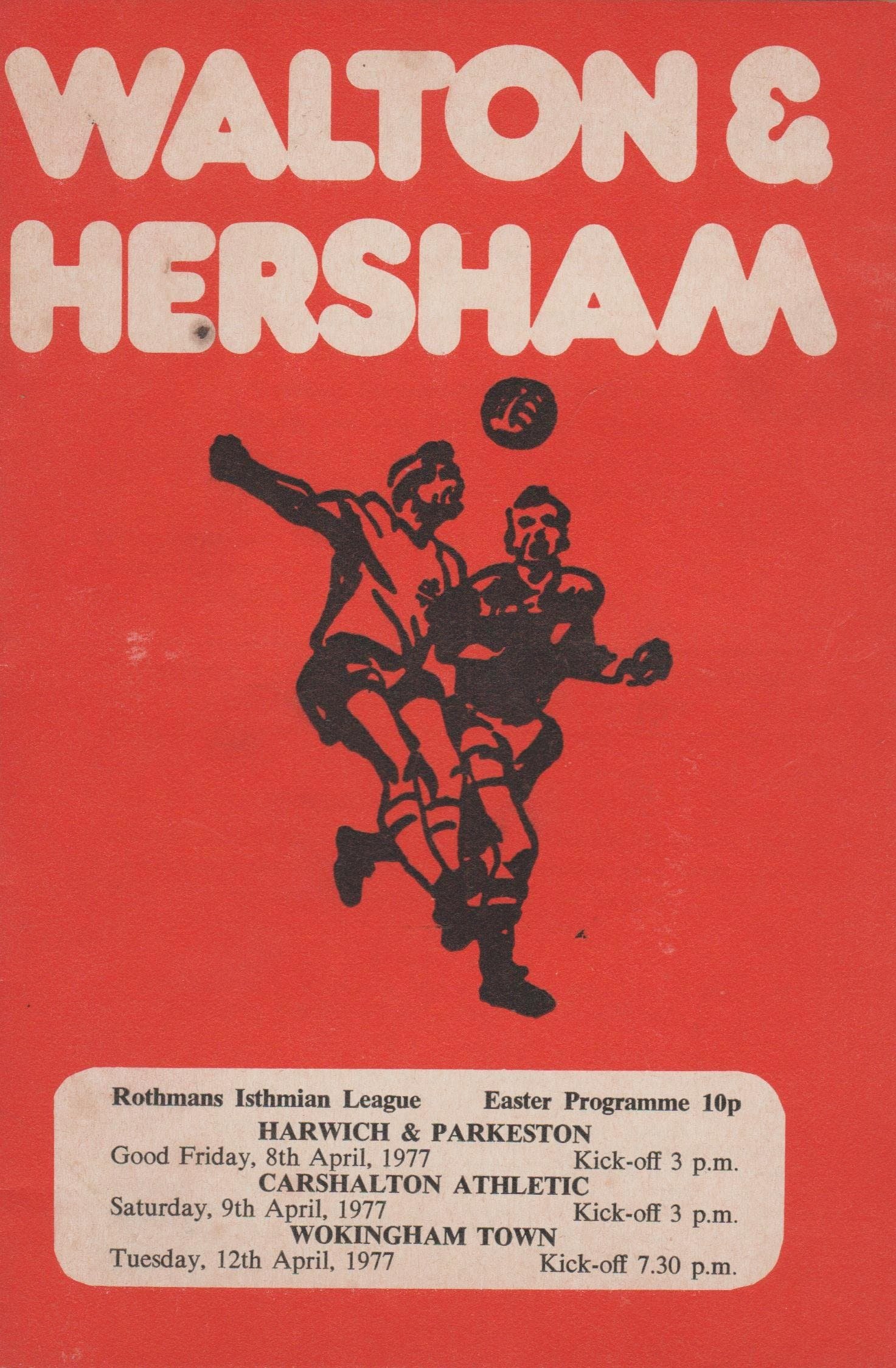 Match: Walton & Hersham v Harwich & Parkeston Competition: Isthmian League Division 1 Date: 08-Apr-1977 Comments: Joint issue for Carshalton/Wokingham games Rating: 4 Condition: Very good Weight in grams: 60