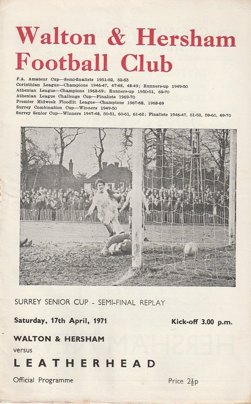 Match: Walton & Hersham v Leatherhead Competition: Surrey Senior Cup Semi Final Replay Date: 17-Apr-1971 Comments: Rating: 3 Condition: Slight staple rust and marks on centre fold, team changes Weight in grams: 60