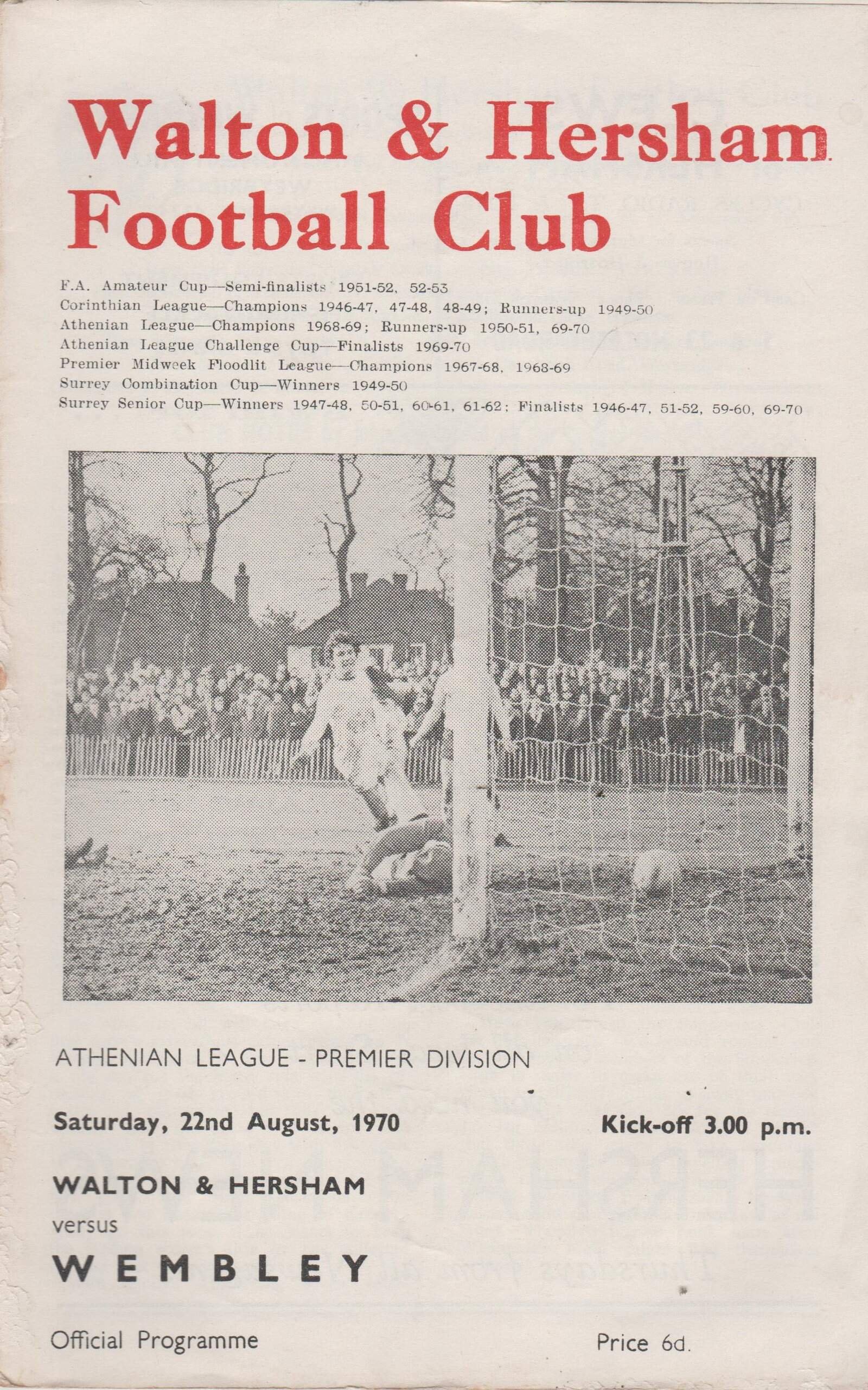Match: Walton & Hersham v Wembley Competition: Athenian League Premier Division Date: 22-Aug-1970 Comments: Rating: 3 Condition: Rusty staple, wear on cover near to spine, team changes Weight in grams: 40