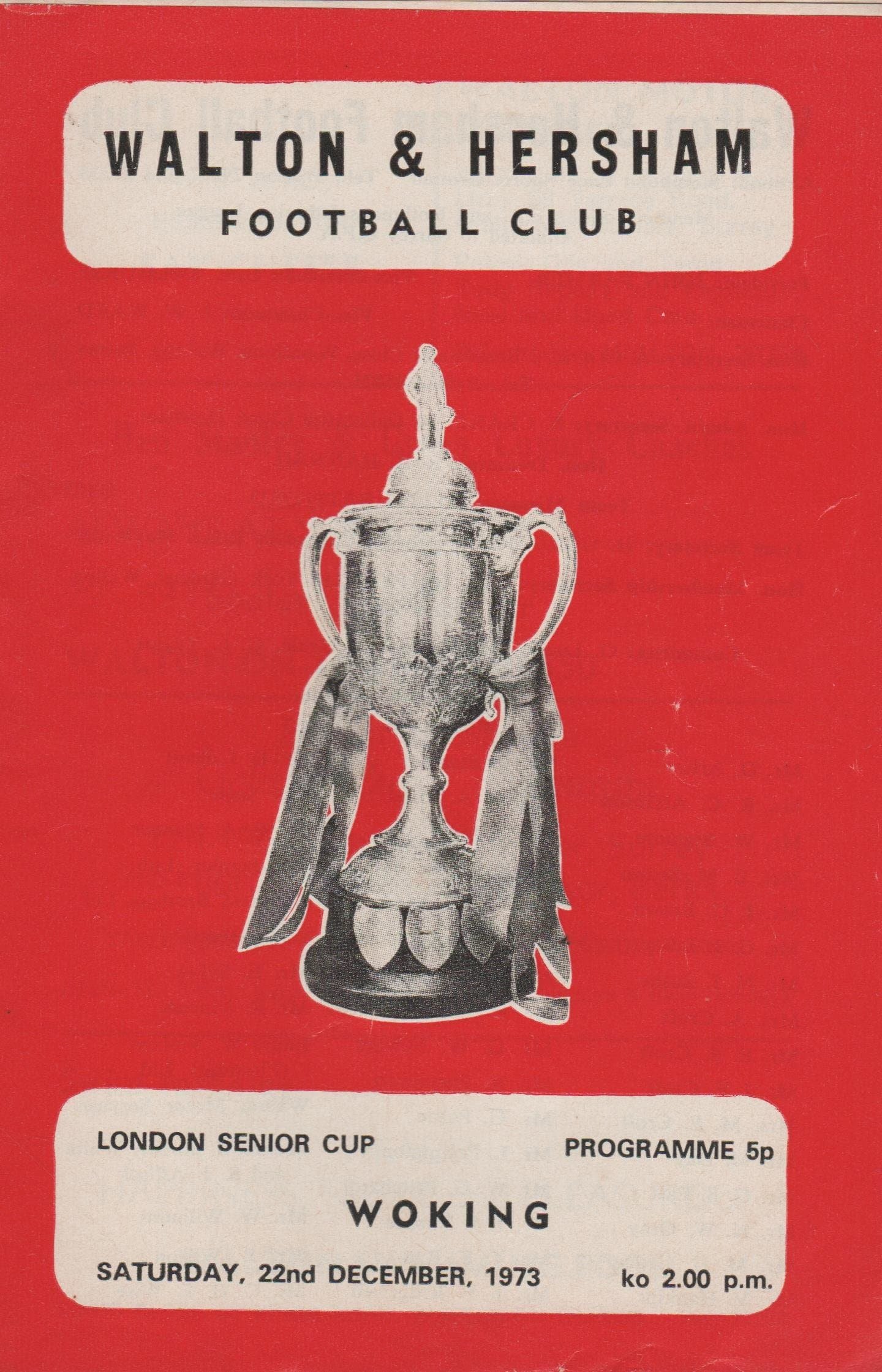 Match: Walton & Hersham v Woking Competition: London Senior Cup 1st Round Date: 22-Dec-1973 Comments: Rating: 3 Condition: Team changes, corner turns on inside pages Weight in grams: 40