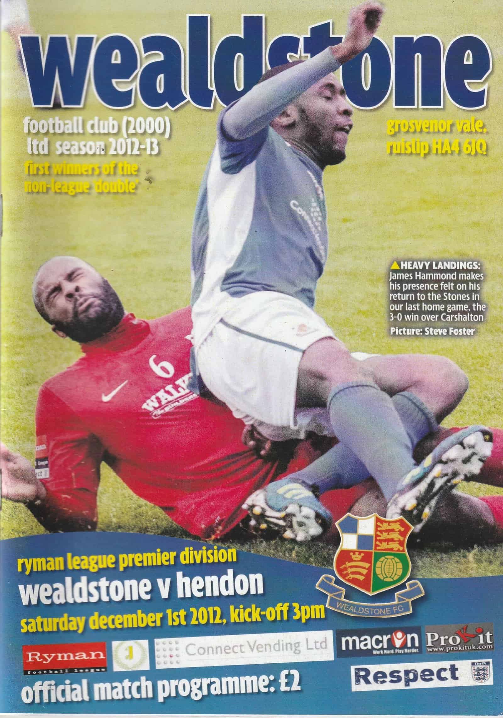 Match: Wealdstone v Hendon Competition: Rymans League Premier Division Date: 01-Dec-2012 Comments: Rating: 4 Condition: Very good Weight in grams: 100