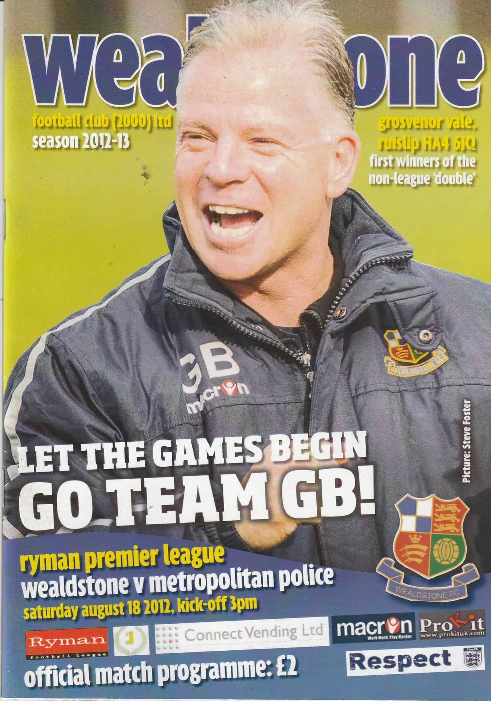 Match: Wealdstone v Metropolitan Police Competition: Rymans League Premier Division Date: 18-Aug-2012 Comments: Rating: 3 Condition: Slight fold on corner of back page Weight in grams: 100