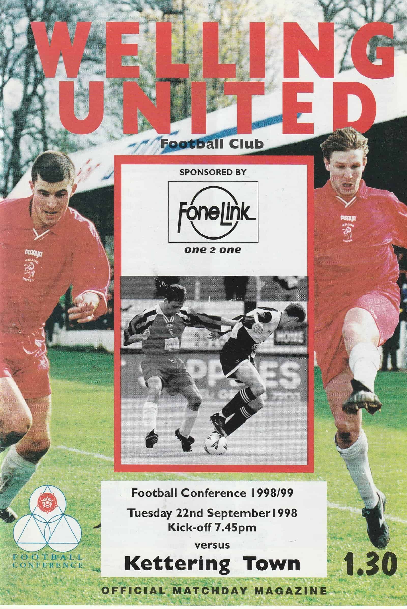 Match: Welling United v Kettering Town Competition: Football Conference Date: 22-Sep-1998 Comments: Rating: 4 Condition: Very good Weight in grams: 100