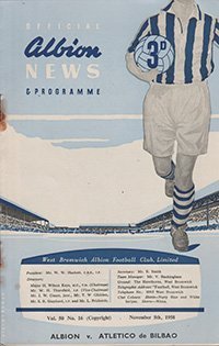 Match: West Bromwich Albion v Atletico Bilbao Competition: Friendly Date: 05-11-1958 Comments: Rating: 3 Condition: Rusty staples, staple bleed Weight in grams: 40