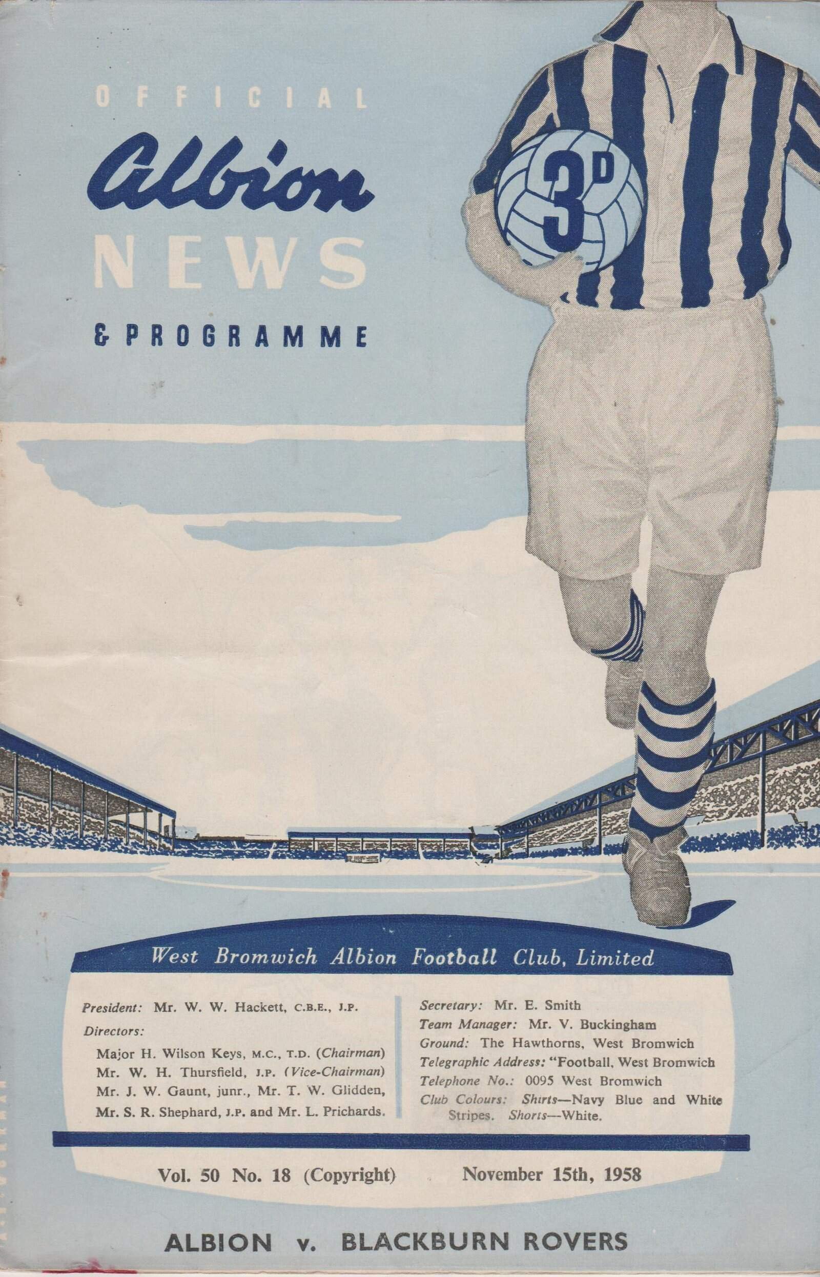 Match: West Bromwich Albion v Blackburn Rovers Competition: League Division 1 Date: 15-Nov-1958 Comments: Rating: 3 Condition: Rusty staples, staple bleed, faint fold Weight in grams: 40