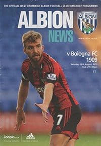Match: West Bromwich Albion v Bologna Competition: Friendly Date: 10-08-2013 Comments: Rating: 4 Condition: Light crease marks on cover Weight in grams: 60
