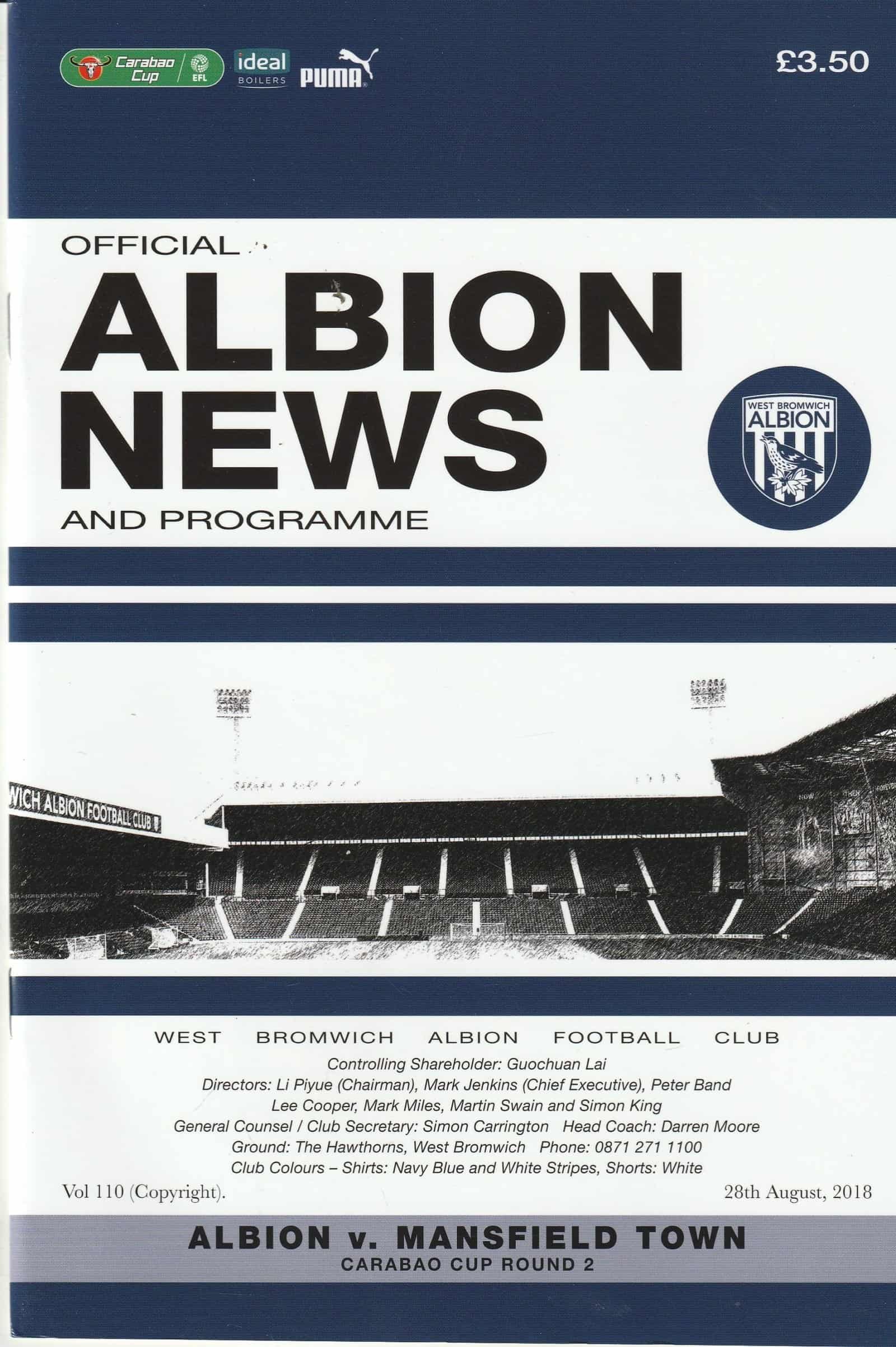Match: West Bromwich Albion v Mansfield Town Competition: Carabao Cup 2nd Round Date: 28-Aug-2018 Comments: Rating: 4 Condition: Very good Weight in grams: 160