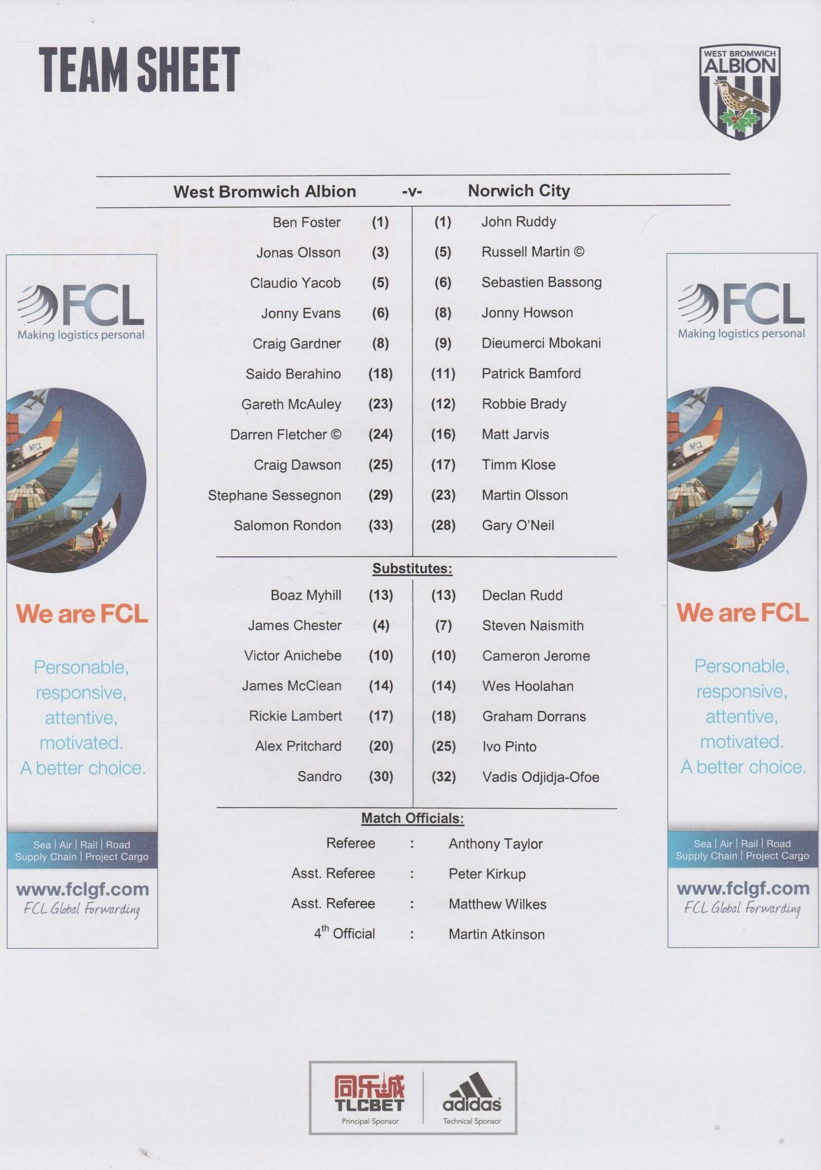 Match: West Bromwich Albion v Norwich City Competition: Premier League Date: 19-Mar-2016 Comments: Rating: 4 Condition: Very good Weight in grams: 20